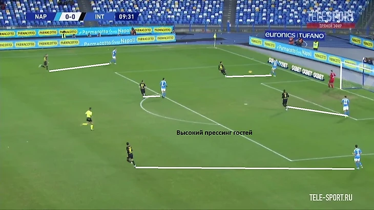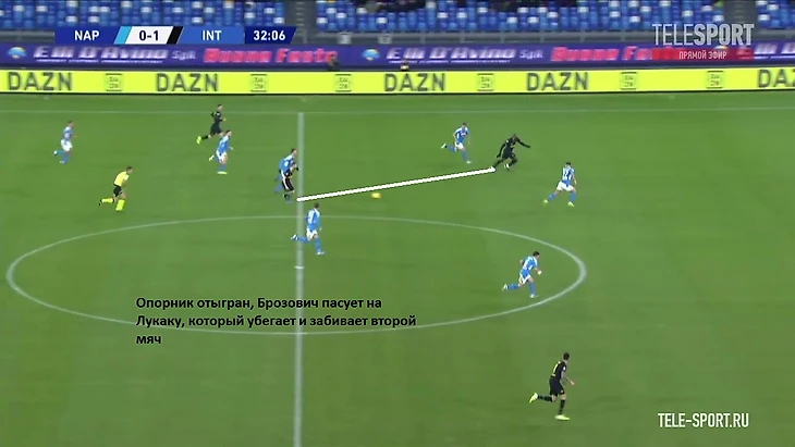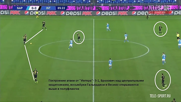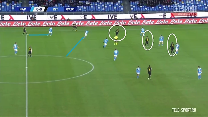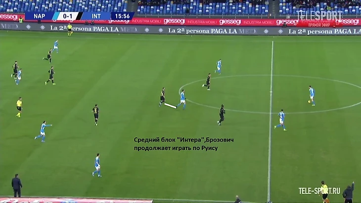 При владении в первом тайме (которое часто было у "Интера" до второго гола) мы видели типичное построение в начале атаки- 3-1 с Брозовичем выше. Однако розыгрыш в центре поля с соперником в среднем блоке удавался нечасто- в большинстве ситуаций при начале атаки от вратаря неаполитанцы встречали гостей отнюдь не гостеприимным прессингом 1-в-1, в основном делая упор на сторону поля, на которой находился мяч, оставляя дальнюю часть (но не всегда,был и прессинг 1-в-1 по всей ширине поля). В некоторых случаях давление приносило свои плоды.