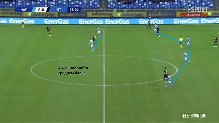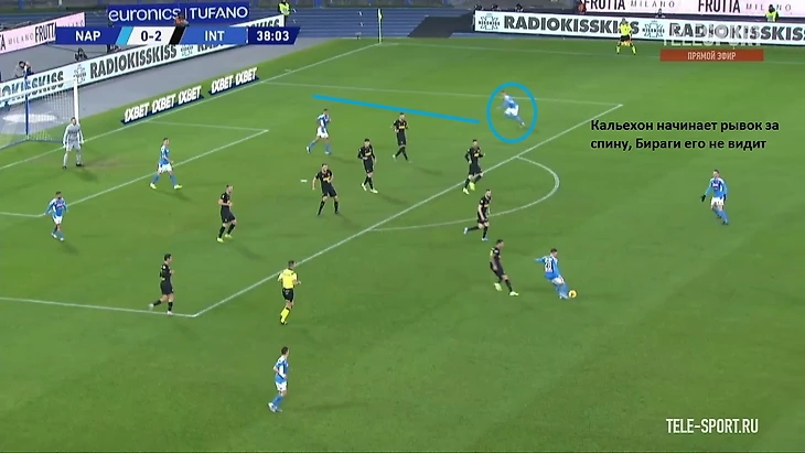 Еще один вариант продвижения, имевший меньшее влияние на создание моментов, чем описанный предыдущий, но который также стоит отметить. Без мяча в среднем блоке хозяева располагались по схеме 4-4-2, где к Милику в верхней двойке присоединялся Аллан. Но в определённых ситуациях на игрока с мячом выбрасывался кто-то из полузащитников (в основном, это крайние полузащитники в данной формации, Кальехон и Зелиньски, на латералей или крайних центральных защитников, сместившихся на фланг). Из-за этого, например, при выбрасывании Кальехона на Бастони открывалась опция паса на латераля, испанца старался страховать Аллан, но не всегда успевал, в результате у Бираги открывалось несколько вариантов продвижения мяча за спины полузащитникам неаполитанцев.