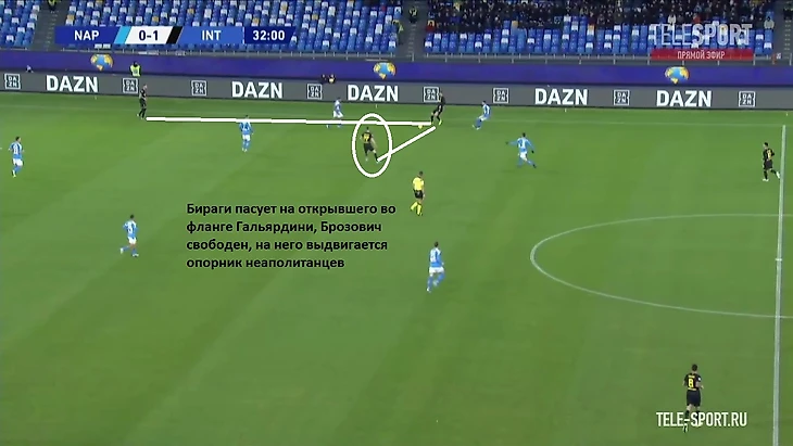 Но у "Интера" был свой ответ на прессинг, несколько раз неплохо проходивший и в следствие которого был забит второй мяч и случился выход 1 на 1 Лукаку на второй минуте, но арбитр зафиксировал офсайд. Розыгрыш заключался в том что бы довести мяч до Брозовича не напрямую через центрального защитника, так как зачастую этот вариант был закрыт, а с участием латераля и восьмёрки на соответствующем фланге (но, так как всё происходило в основном на левом фланге, то сразу скажем, что это были Бираги и Гальярдини). Левый центральный защитник Бастони пасовал на Бираги, в это время Гальярдини открывался на фланге (его поджимал, но активно не выбрасывался Хюсай) и переадресовывал мяч опорнику "Интера", который уже находился в хорошей позиции и мог самостоятельно продвигать мяч (как во втором голе на скриншотах), так и забрасывать на нападающих.