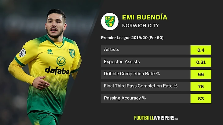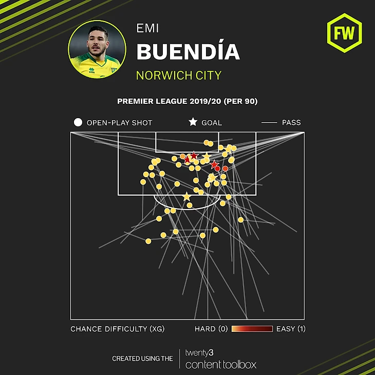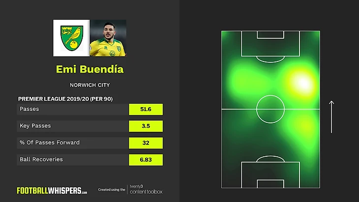 Самой интересной особенностью игры Эмилиано является эффективность его действий по всей ширине поля. Карта ударов и передач, представленная выше, хорошо это подчеркивает. Как правило, он начинает матчи справа в центре, однако большинство ключевых пасов отдает из зон, традиционной закрепленных за «десяткой». Еще одним приятным бонусом для «Норвича» является умение Буэндиа исполнять стандарты (пусть это и не самая сильная сторона полузащитника).