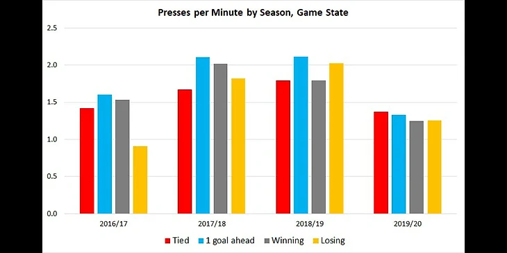 Хотя достижения мед.штаба Ливерпуля заслуживают отдельного анализа, в первую очередь сменилась идеология. Время романтики прошло. Если Ливерпуль первых лет был командой, которая при счете 3-0 бежит забивать четвертый, то сейчас это команда, которая еще при 0-0 держит в уме и завтрашний день. Это субъективное ощущение, хорошо подтверждает график ниже.