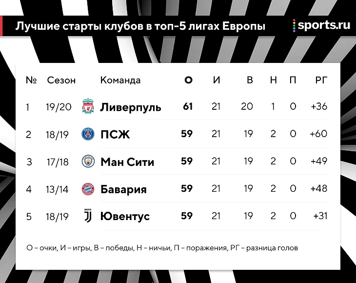 • Самый грандиозный факт. «Ливерпуль» выиграл 20 стартовых матчей из 21 и набрал 61 очко – до этого в топ-5 лигах Европы такое не удавалось никому. Даже «ПСЖ»!