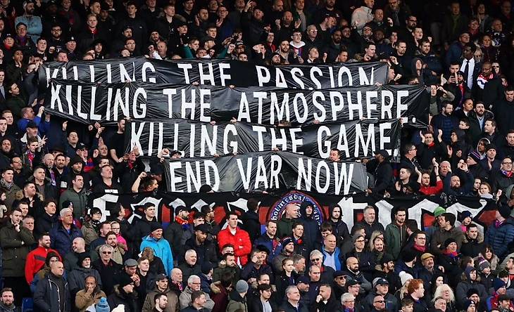 В матче с «Арсеналом» фанаты «Кристал Пэлас» вывесили баннер: «Убивает страсть, убивает атмосферу, убивает игру. Выключайте ВАР!».