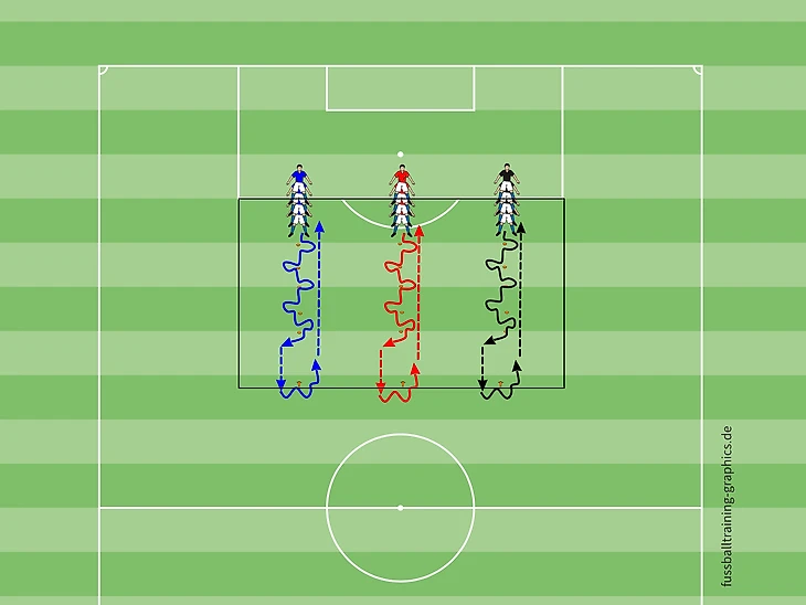 12 человек делятся на 3 команды, и в течение 10 минут разминаются на участке примерно 25х20 метров, где у каждой команды расставлены по 5 фишечек на расстоянии 2 метра друг от друга и один конус в 10 метрах от них. Разминка включает в себя как бег без мяча (ABC, с подъемом коленей, приставными шагами, откидыванием ног назад, вприпрыжку и т.п), так и с мячом (свободный дриблинг, дриблинг лишь внешней / внутренней стороной стопы, дриблинг с финтами и т.п). При желании можно добавить соревновательный элемент - проводить эстафету между командами, но только если игроки достаточно разогреты.