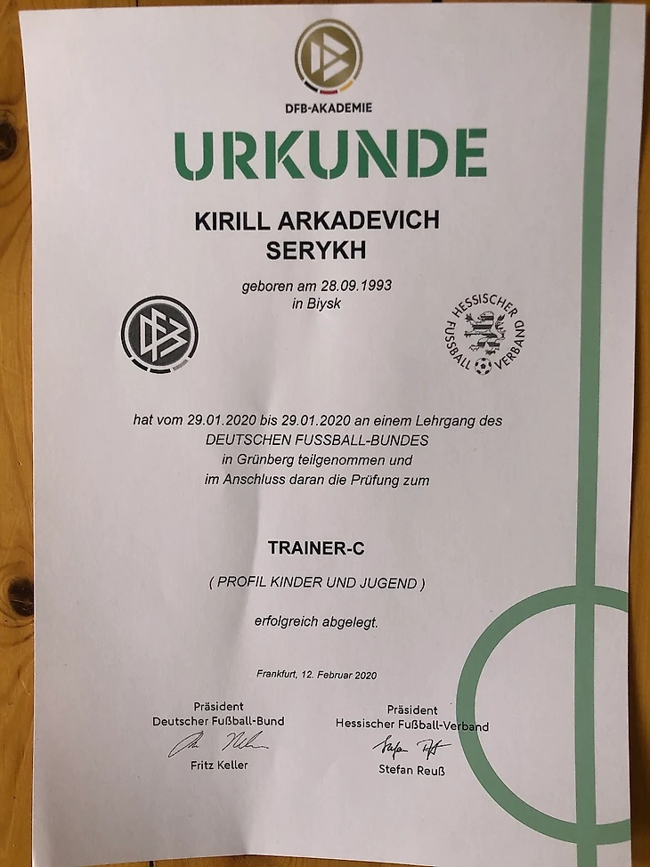 В итоге я сам позвонил в DFB Hessen через полторы недели после экзамена, и они уже сами подтвердили, что я сдал :) Скажу честно, я сильно опасался, что у меня вышло не очень, так как мне до сих пор непонятна тема, да и вообще - есть личное ощущение, что такие элементы стоит отрабатывать уже в более старшем возрасте, начиная лет с 15. В итоге, мои итоговые документыо сдаче экзамена добрались до меня через 15 дней после экзамена, спустя несколько звонков и писем в федерацию футбола Гессена.