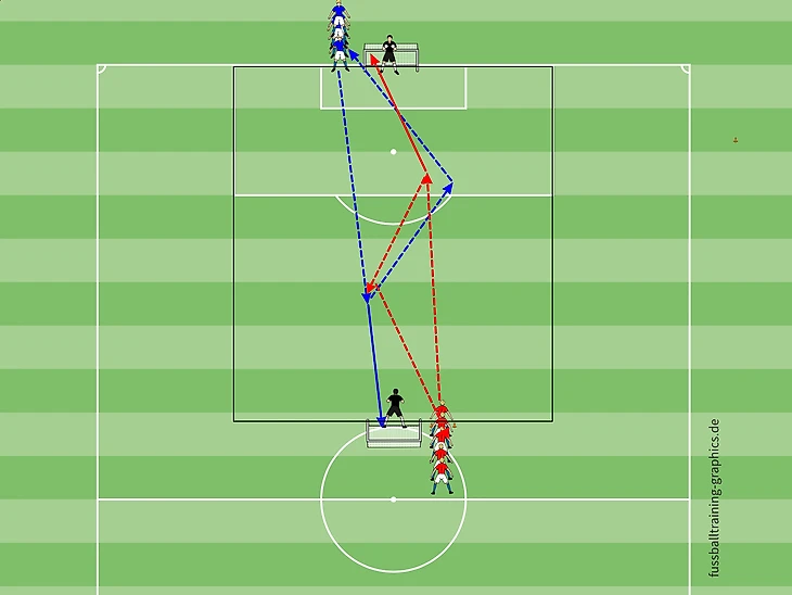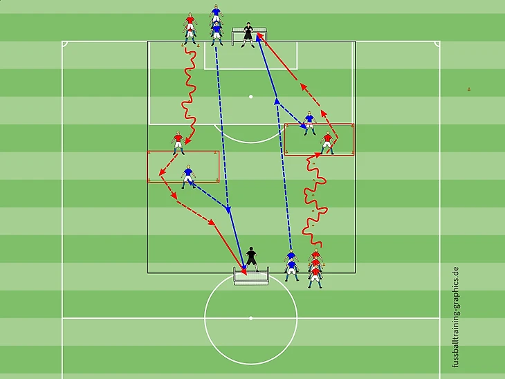 Это упражнение увидел мой друг, находясь в отпуске на Фарерах в прошлом году, и мы решили, что оно подходит к этой теме. 12 человек делятся на 2 команды по 5+1. Допустим, начинает команда красных, игрок доходит минимум до штрафной, наносит оттуда удар, и во время нанесения удара с мячом стартует игрок синей команды. Он сразу же стартует с максимальной скорости, в то время как первый игрок красной команды пытается догнать его и отобрать мяч. Цель игрока синей команды - добежать минимум до штрафной и забить гол, и как только он наносит удар - первый игрок из красной команды возвращается назад на начальную позицию, а свою атаку наносит следующий игрок красной команды и теперь уже первый игрок синей команды играет возвращающегося защитника.