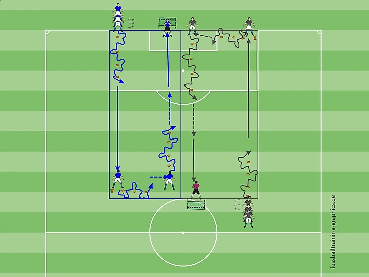 Площадка 43х40 делится на две части, равные по ширине, на которых распологаются 2 команды по 6 человек. У каждой команды есть три станции: в начале игрок проводит мяч через 4 фишки, отдает пас игроку на противоположной стороне, тот проводит мяч через 2 фишки и отдает пас игроку напротив (можно просить игроков не отдавать пас, а двигаться с мячом к следующему игроку на максимальной скорости). Третий игрок снова проводит мяч через 4 фишки, добегает с ним максимум до 11 метров от вратаря и наносит удар по воротам. Каждый из этих трех игроков, участвующих в упражнении, занимает позицию следующего игрока, в то время как последний игрок возвращается на стартовую позицию. 2 свободных игрока могут отрабатывать пасы или прием мяча в зоне около начала упражнения, чтобы быть задействованными с мячом во время ожидания. Упражнение выполняется на скорость, за гол рабочей ногой начисляется 1 очко, нерабочей - 2 очка.