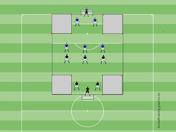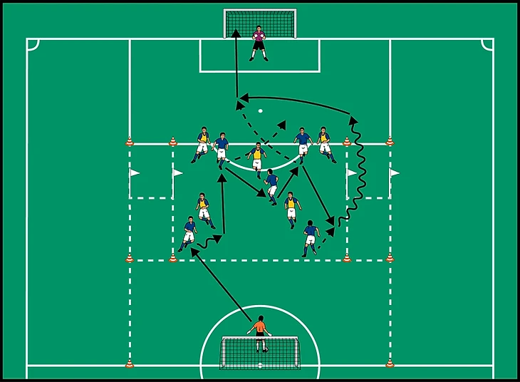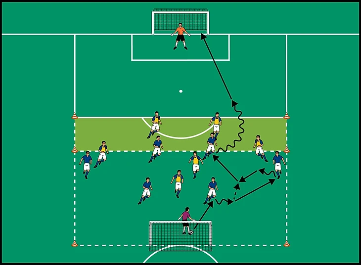 Это упражнение я нашел на сайте DFB в категории скоростного дриблинга, и не был полностью уверен, подходит ли оно по теме. Во время разговора с бывшим коллегой мы пришли к выводу, что в принципе, оно подразумевает проход с мячом на высокой скорости: а значит, подойдет. Команды играют матч 5 на 5 с условием, что у защищающейся команды остается 2 защитника в центральной зоне. Задача атакующей команды, совершив минимум 3 паса, отдать пас игроку, который на скорости пройдет через центральную зону и забьет гол. Если игроки защищающейся команды перехватывают мяч, то они переходят в атаку 5 на 5. Команды играют 4 тайма по 5 минут, меняясь ролями каждый тайм. Защищающаяся команда меняет пары игроков в центральной зоне после каждого забитого мяча соперника.