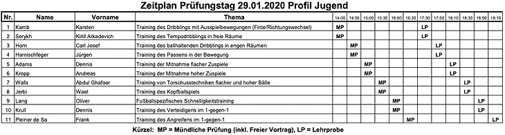 Начну с предыстории - темы экзамена были разосланы за 12 дней до его проведения. Экзамен состоял из устной части (30 минут) и практической части (20 минут). Перед устной частью экзаменуемый отдает экзаменатором (в моем случае это были два тренера из DFB) план тренировки, состоящий из 5 частей - общая / специальная разминка, основная часть 1 (упражнение на элемент), основная часть 2 (игровая форма на элемент) и закрывающая часть (игра). Во время устной части нужно подробно описать свои 2 основные части, а также ответить на теоретические вопросы по упражнению или по теме экзамена. Практическая часть - это тренировка со случайной командой (но в рамках заданного возраста, по направлению "юношеский футбол" это могла быть любая команда от 11 до 19 лет), где нужно провести как раз те два упражнения из устной части экзамена.
