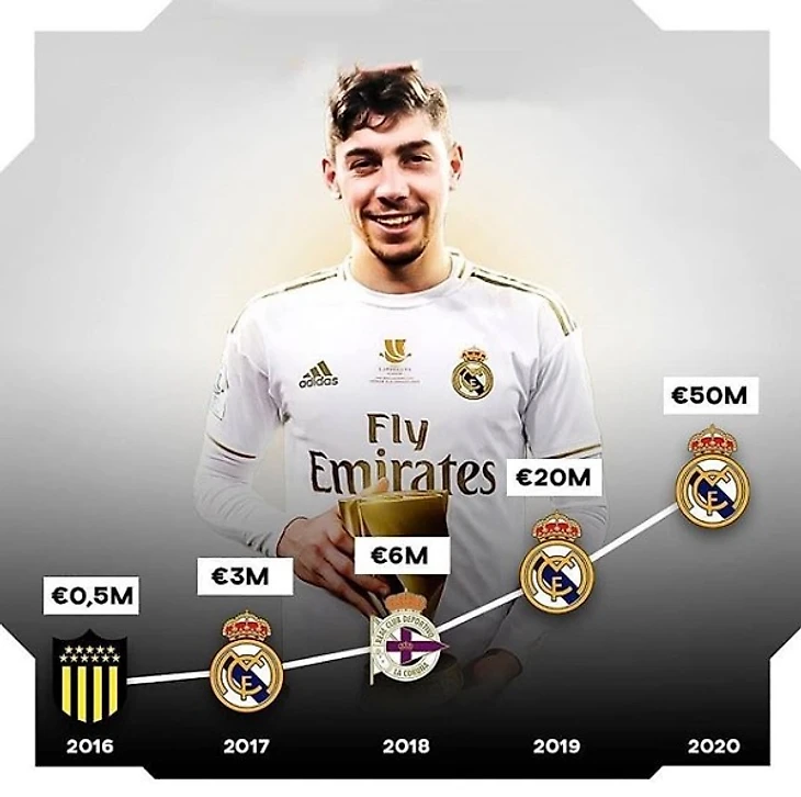 Самое время вспомнить, как росла трансферная стоимость Федерико Вальверде на протяжении всей его карьеры.