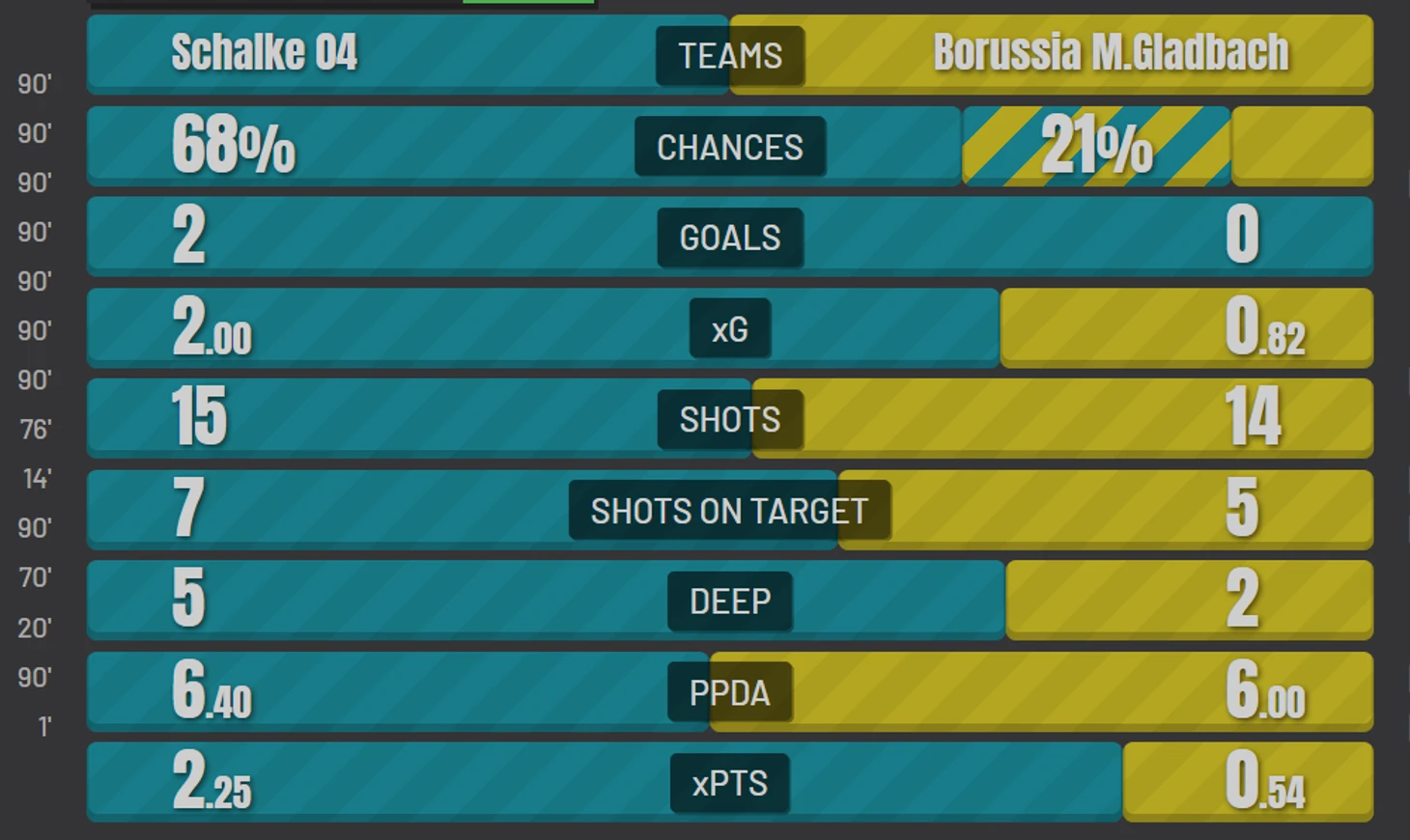 Любителям статистики также прилагаю фото с различными показателями, дающими почву для анализа. Здесь можно увидеть и впечатляющую эффективность прессинга "Шальке" и более, чем двойной перевес хозяев в xG (ожидаемые голы), а также ещё много интересной информации.