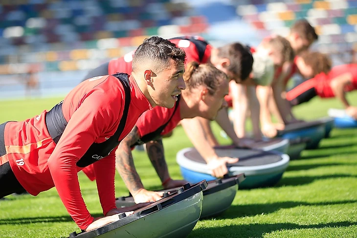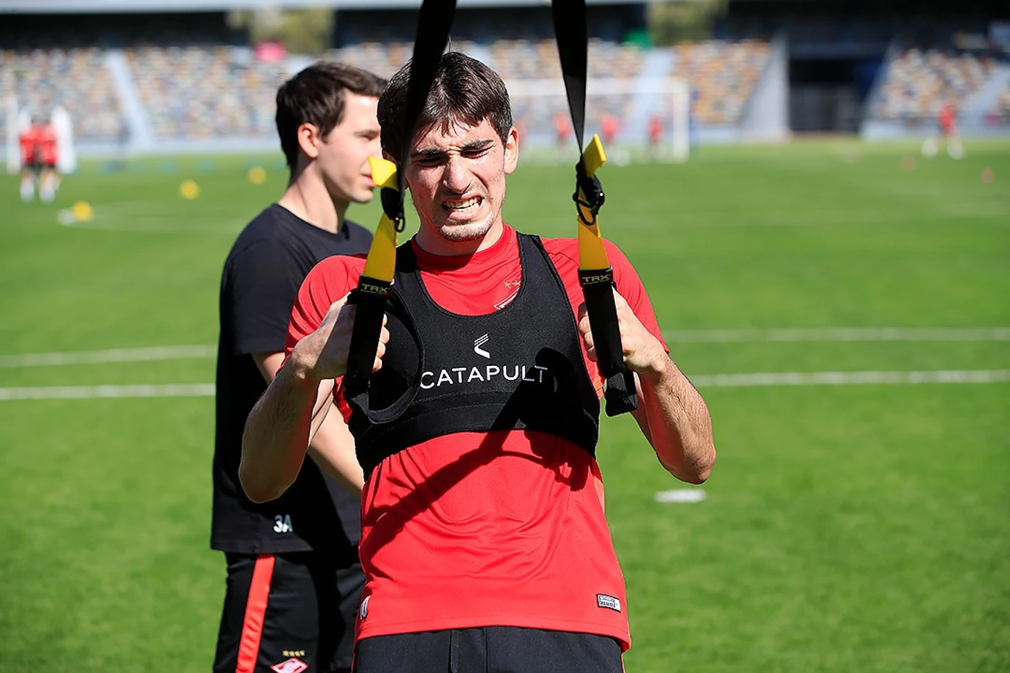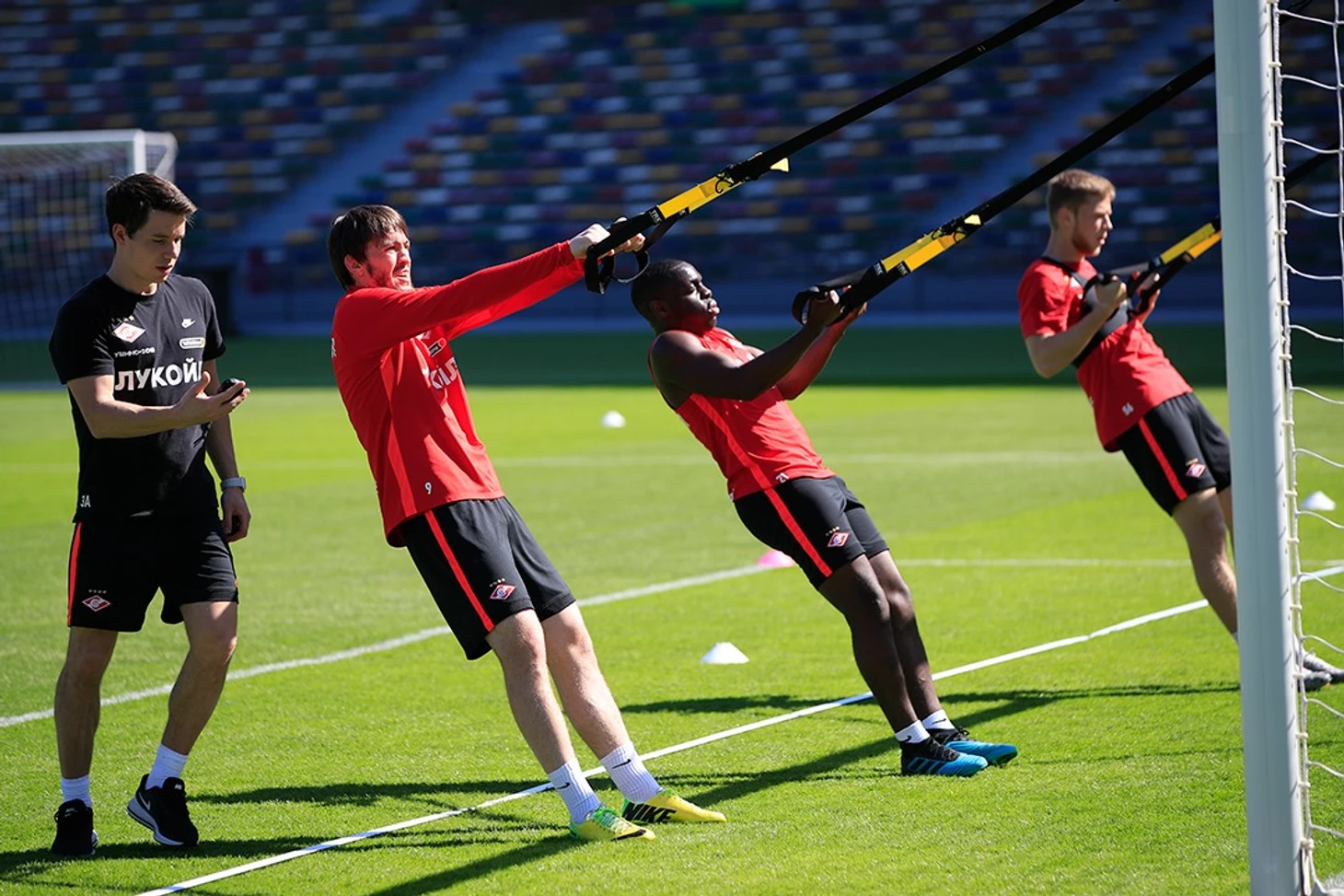 Футболисты красно-белых разделились на три группы, которые в течение часа совершали беговую работу на различных станциях. В паузах между забегами игроки выполняли силовые упражнения.