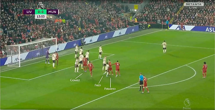 4. «МЮ» использует зональный способ обороны при угловом. «Ливерпуль» создает идеальные условия для Ван Дейка. Фирмино блокирует Фреда, создавая разрыв между ван Дейком и Уильямсом. Гомез играет по Магуайру. Во время подачи, он немного придержит защитника «МЮ», таким образом, предотвращая полноценное участие в эпизоде.