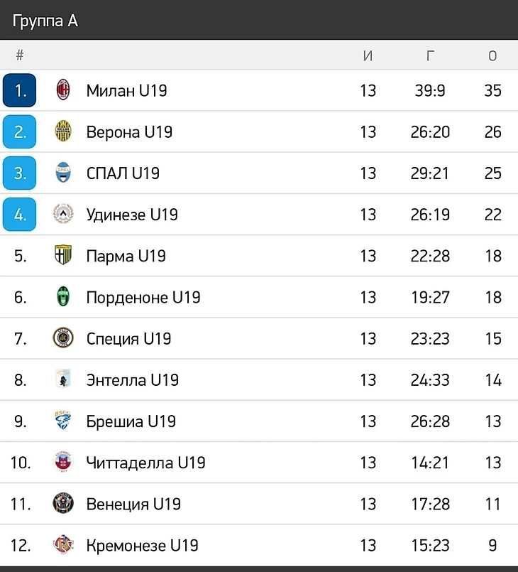 Примавера «Милана» на 1 месте, имея в активе 35 очков.