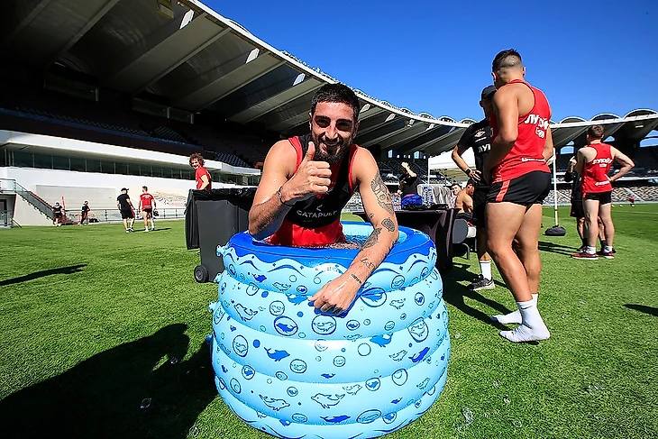 Про физику я подробно писал в одном из текстов, вышедших в середине сбора. «Спартак» стабильно тренировался три раза в день. И хотя сам Тедеско раннюю работу в спортзале за тренировку не считает, фиксируем, что первые нагрузки игроки получали уже в 8 утра. Что еще важно. Многие тренировки в Абу-Даби (в основном утренние) — проходили вообще без мяча. И Доменико совсем не волновало, что футболисты этого не любят. Если надо сделать столько-то забегов по 100 или 200 метров в определенном темпе, это будет сделано. Без пряника в виде привычных квадратов в начале или ударов по воротам в конце. Впрочем, после беговых упражнений энергии почти ни на что уже не оставалось. Говорю «почти» — потому что пару раз игроки все-таки нашли в себе силы окунуть тренера по физподготовке Владимира Чепзановича в бочку с ледяной водой. Благодарность за нагрузки и заодно необходимая разрядка. Чепзанович не обиделся.