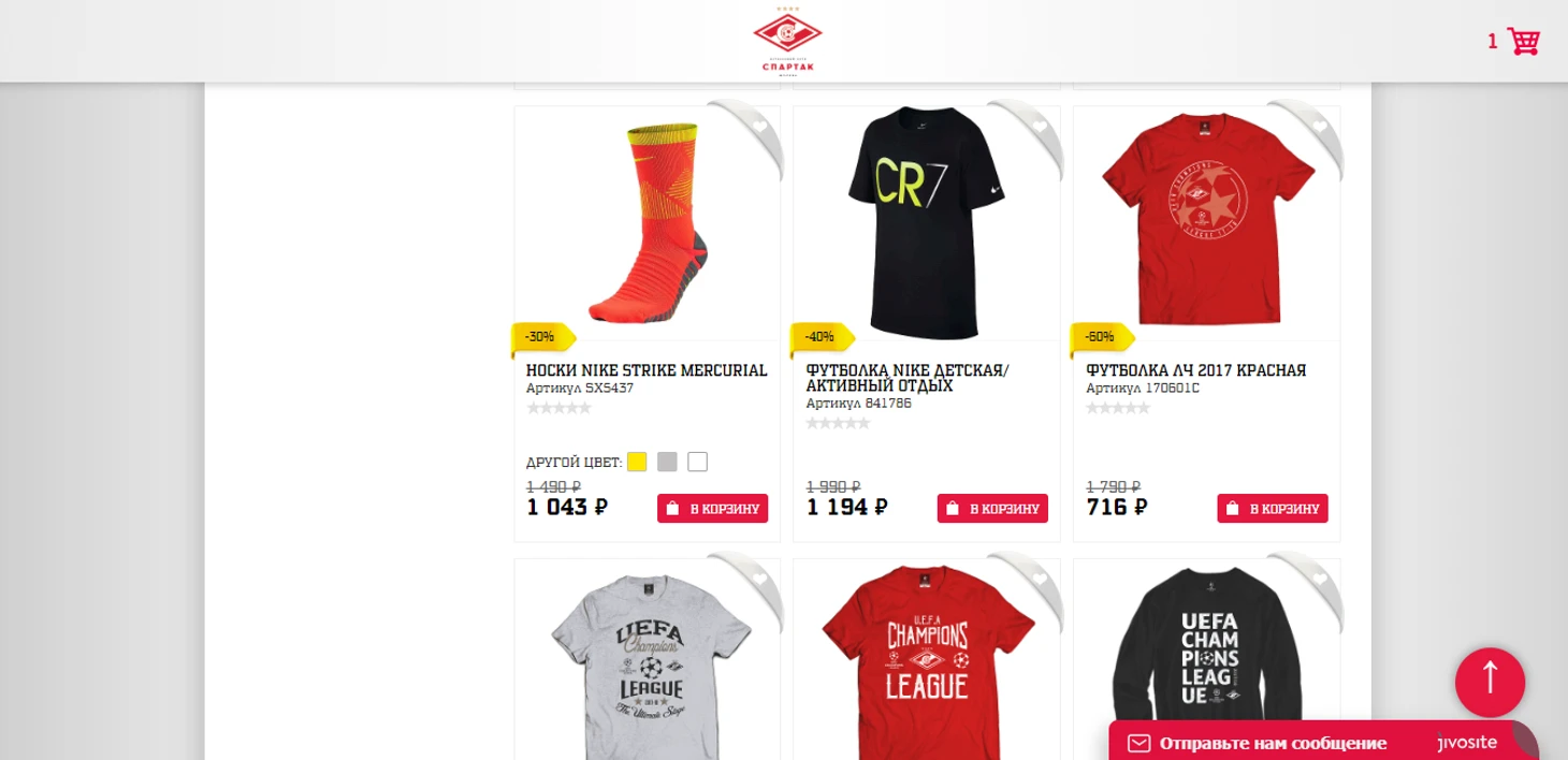 Главная страница при первом посещении пугает кашей из текста и картинок и к этому надо сначала привыкнуть. Все ярко, в красно-синих цветах клуба. Радует наличие чат-бота, связи по телефону и даже WhatsApp. Из товаров на главной аж 7 предложений. Это киберпонедельник (с 25 по 30 января), постельное белье, Extreme hobby c спортивной экипировкой в темных тонах, распродажа, зимняя коллекция, чехлы на телефон и детские товары. Именно в таком порядке. Я говорил, там каша. Интересная, но сложноусваиваемая.
