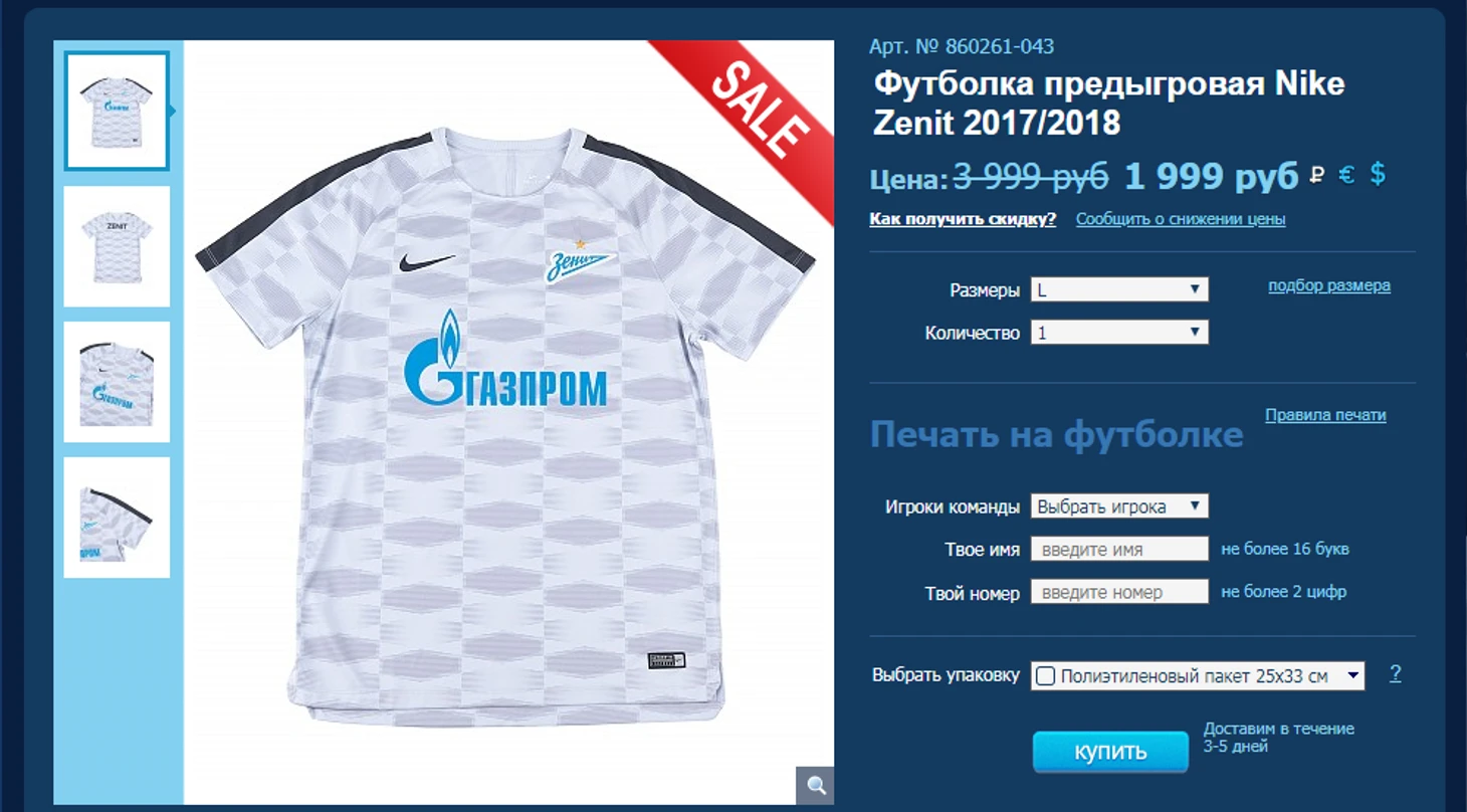 Цены в магазине относительно неплохие с учетом проработанности сайта, высокого сервиса и высокого ассортимента. Домашняя форма «Зенита» сезона-19/20 от Nike обойдется вам в 3800 руб. за реплику. Интересный факт, заявлено, что она сделана в Грузии.