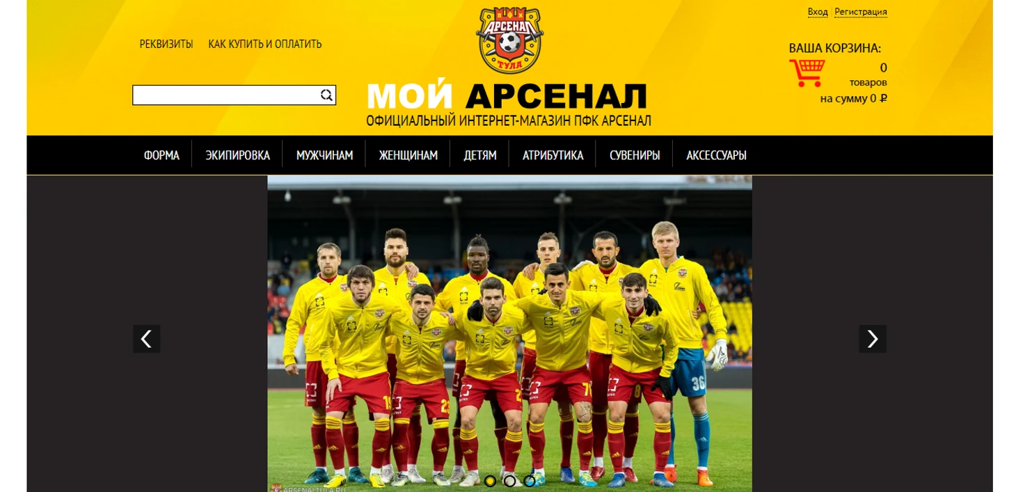 Главная страница туляков (сайта отдельного нет, есть раздел на сайте клуба) встречает фотографией основного состава перед матчем. Нажимаем Ctrl+P и все. Дешево и сердито. А если серьезно, то на главной помимо некликабельной фотки состава есть фотка пуховика (Арсенал, пуховик... не, не косят, показалось.) и формы клуба из раздевалки. Все это некликабельно и разных размеров. Жмем «ФОРМА/Игровая форма 18/19» – элемент не найден. Сначала непонимание, почему нет формы сезона-19/20, потом удивление отсутствию формы как таковой. Пойдем другим путем. «Экипировка». Только один шарф. То же самое в сувенирах и вообще в любом разделе. Обращаю внимание на квадратики сверху. А тут и спрятано все то, что должно быть в обычных разделах. Наконец-то...