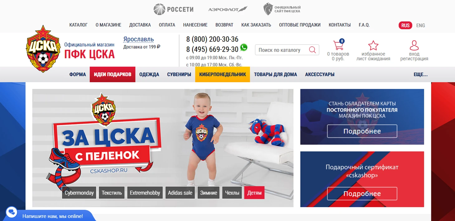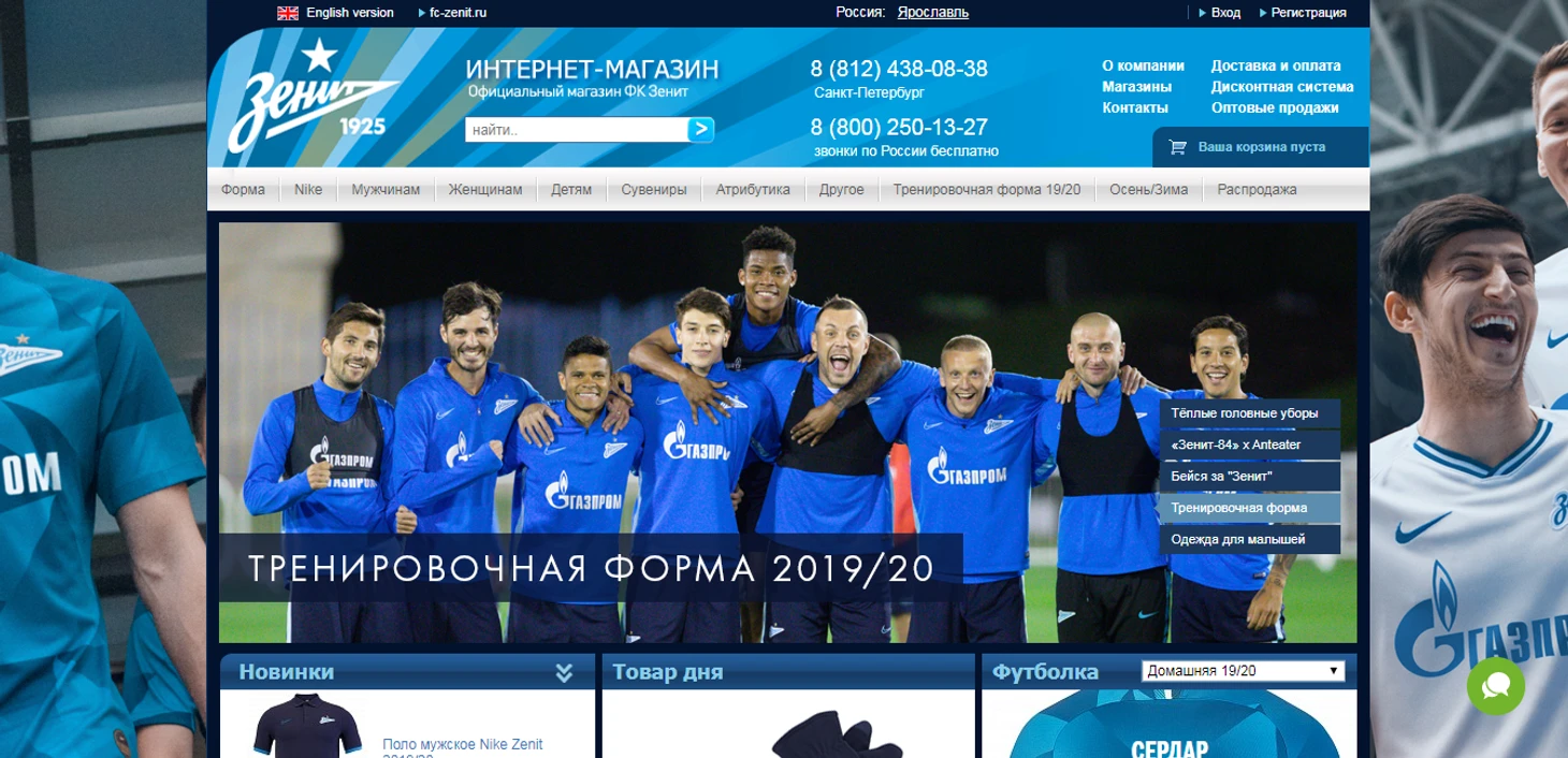 Главная страница клуба из северной столицы встречает нас приятным оформлением в сине-голубых клубных цветах. Флагманские коллекции сменяют друг друга. Приветственно звенит уведомление от чат-бота с предложением помочь с любым вопросом. Есть два телефона для связи. Ассортимент радует уже на главной странице. Игровая и тренировочные формы, актуальные зимние головные уборы, трендовые сейчас у футбольных клубов товары для малышей и, видимо, гордость магазина коллекция одежды «Зенит-84» x Anteater. А так в магазине есть очень много позиций. От банальных канцтоваров, до кондитерских изделий.