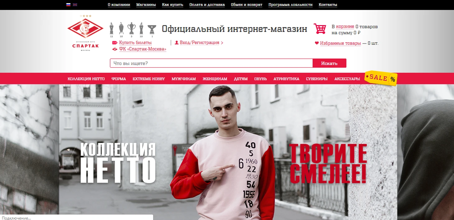 Главная страница народной команды выглядит достаточно строго и встречает каламбуром Коллекция Нетто и баттл-рэпером Млечный на фото. Неожиданно. Так же предлагается приобрести купить товары, прибыль с которых отправляется на благотворительность (мое почтение, первый клуб РПЛ, у которого увидел такое на сайте), коллекция одежды для активных видов спорта, детская коллекция и капсульная коллекция, посвященная Москве. Правда, приобрести можно только в физическом магазине. Но только 1 фото, при клике на которое вылезает ошибка. Такое.