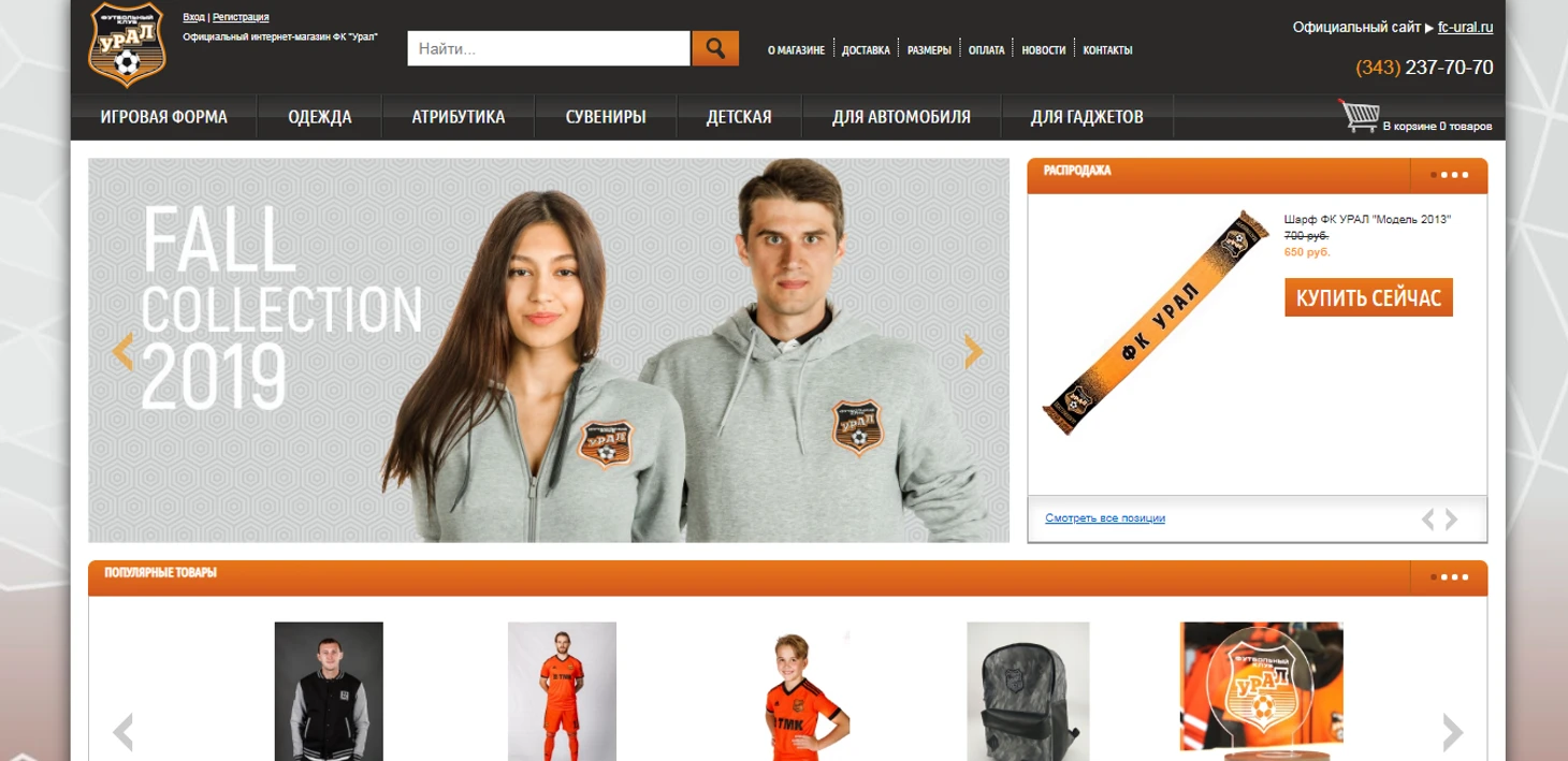 Главная страница магазина уральцев приятно удивляет свежестью, особенно на фоне соседей по таблицы. Оранжевый и черный цвета классно сочетаются, красивые картинки с предложениями осенней коллекции одежды, детской одеждой и бейсболками. Все достаточно просто, но выглядит приятно.