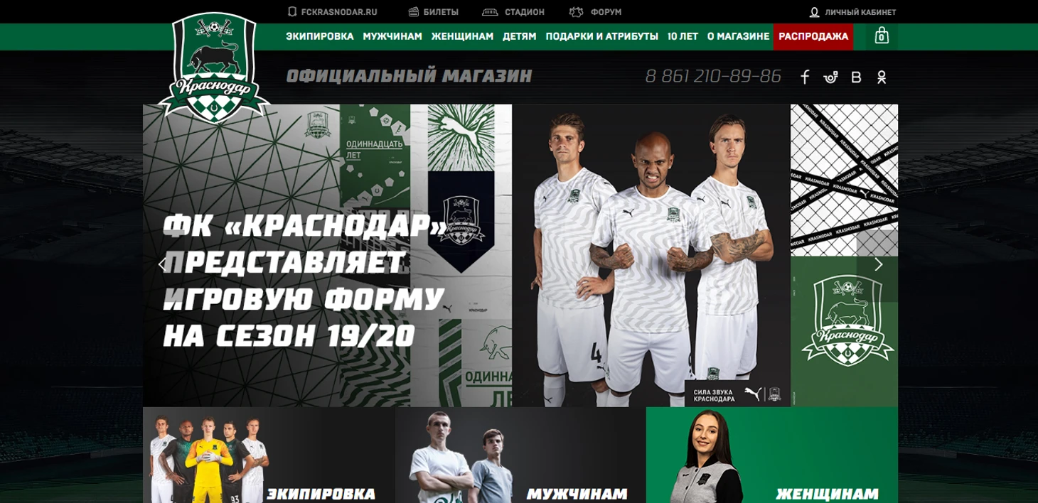 Главная страница фаншопа краснодарского клуба на фоне зенитовского кажется строже, выполнена в темно-зеленых тонах. Нас встречают звезды «Краснодара», представляющие игровую форму нынешнего сезона.