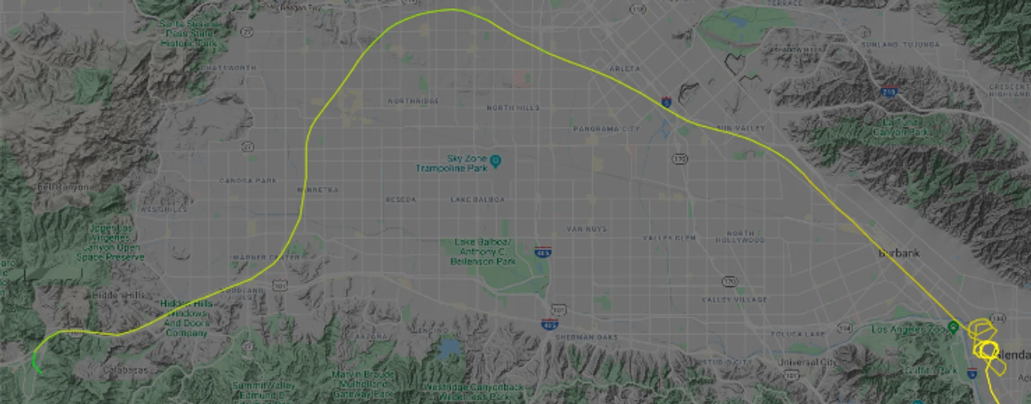• В середине полета, когда вертолет находился над районом Глендейл, диспетчеры передали пилоту информацию о сильном тумане впереди по маршруту, и попросили занять зону ожидания – чтобы обеспечить безопасное расстояние от самолета, которые уходят на второй круг в соседнем аэропорту. Видимо, с этим связано несколько разворотов над Глендейлом.