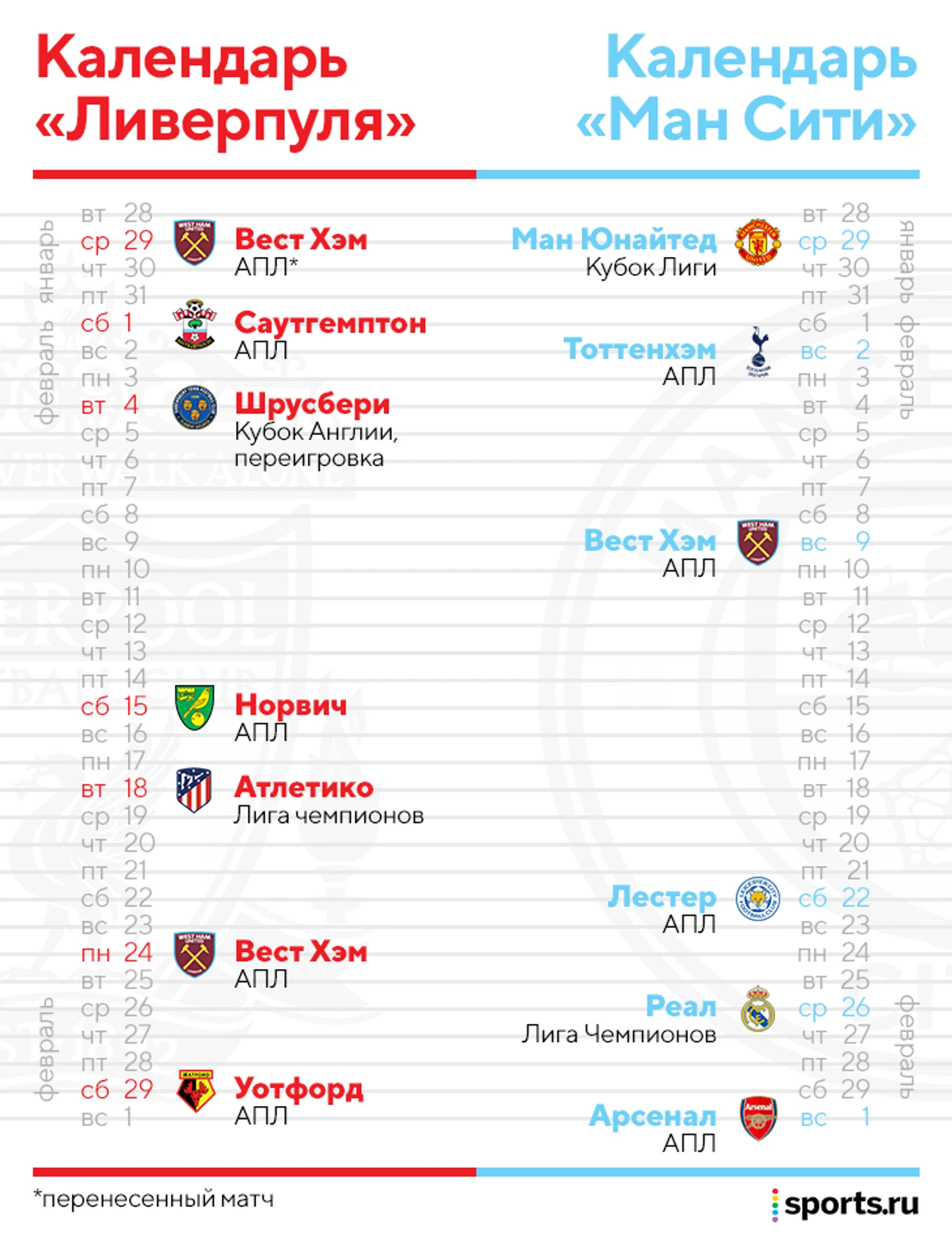 • 3 матча за 10 дней: «Норвич» (15.02), «Атлетико» (18.02) и «Вест Хэм» (24.02).