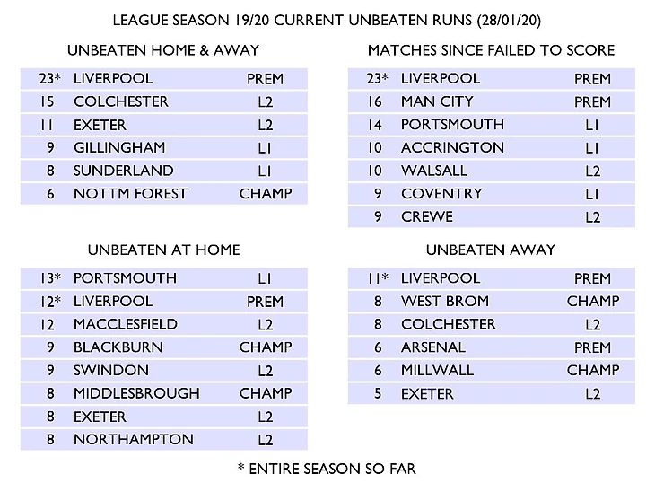 Беспроигрышные серии клубов топ-4 лиг Англии в сезоне 2019/20