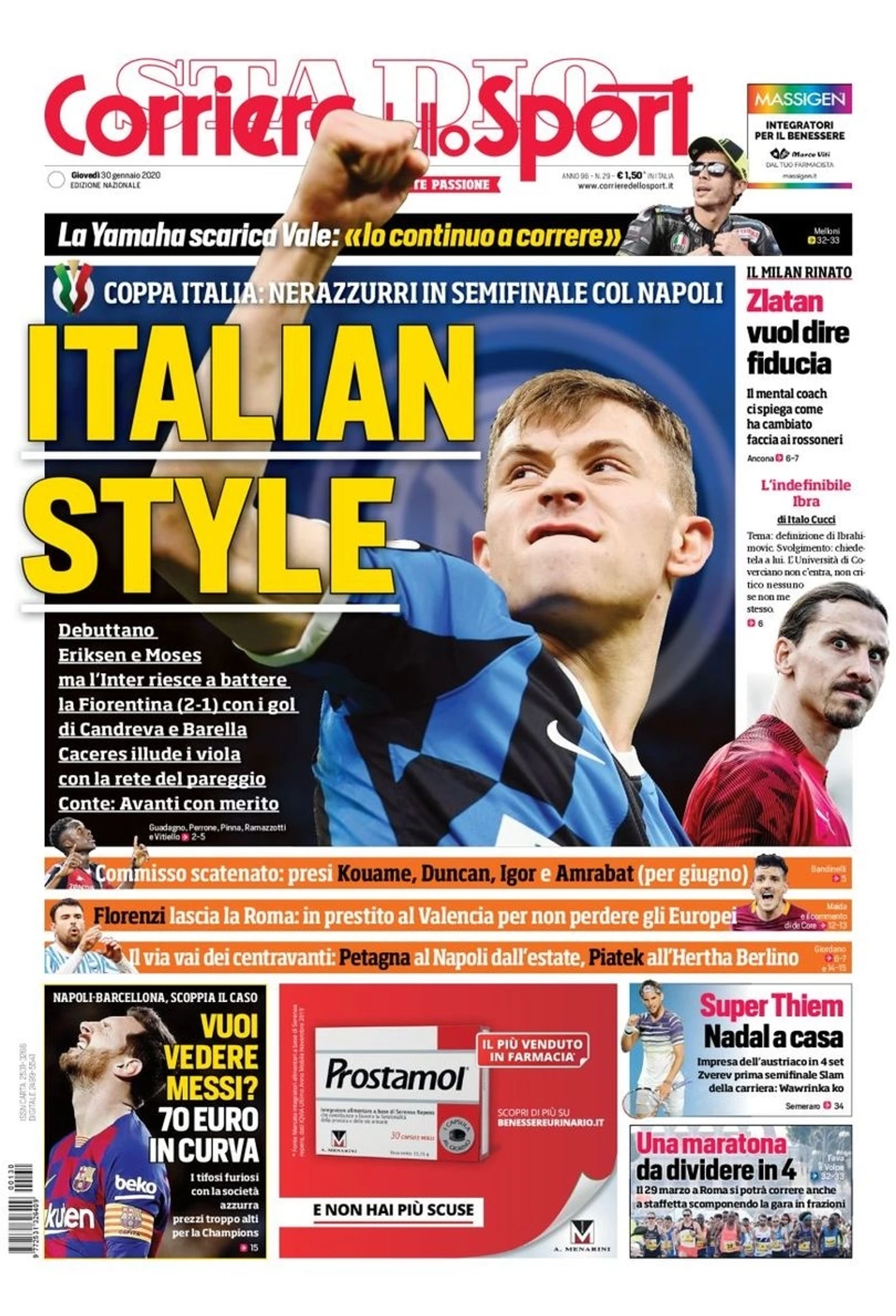 Кубок Италии: Нерадзурри сыграют в полуфинале с «Наполи». Дебютировали Эриксен и Мозес, но «Интер» победил «Фиорентину» (2:1) благодаря голам Кандревы и Бареллы. Касерес подарил «фиалкам» ложную надежду со сравнявшим счёт голом. Конте: «Заслуженно прошли дальше».