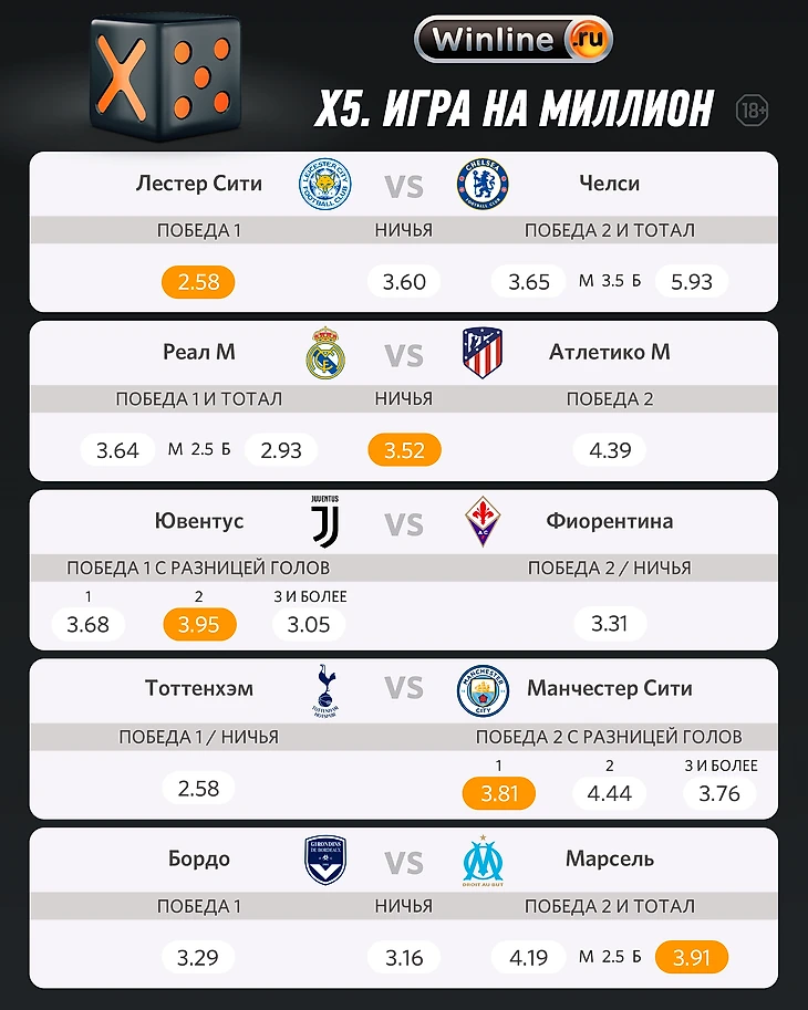 Вы находитесь в блоге «Winline – игра на миллион», который мы ведем вместе с букмекерской компанией Winline. Еженедельно один из наших авторов делает пять прогнозов на ближайшие матчи. Вы тоже можете их сделать в приложении Winline – и если отгадаете все пять, получите миллион рублей. Участие бесплатное.