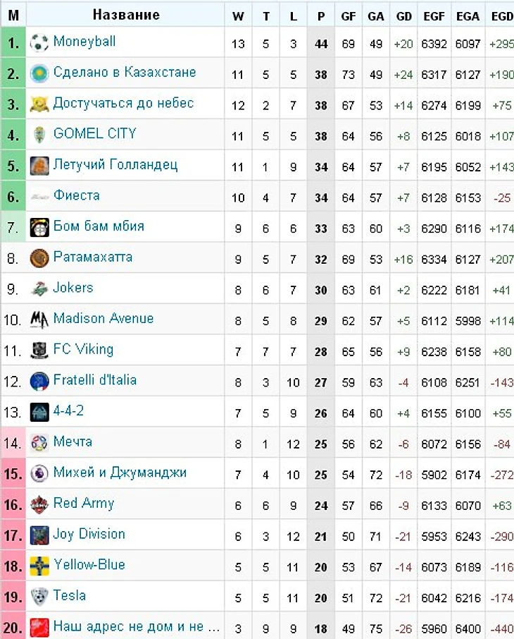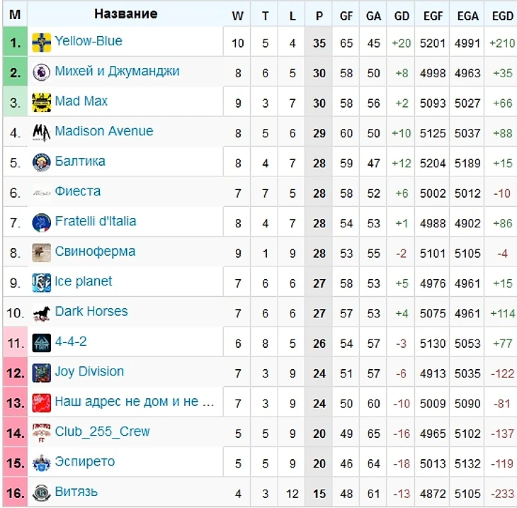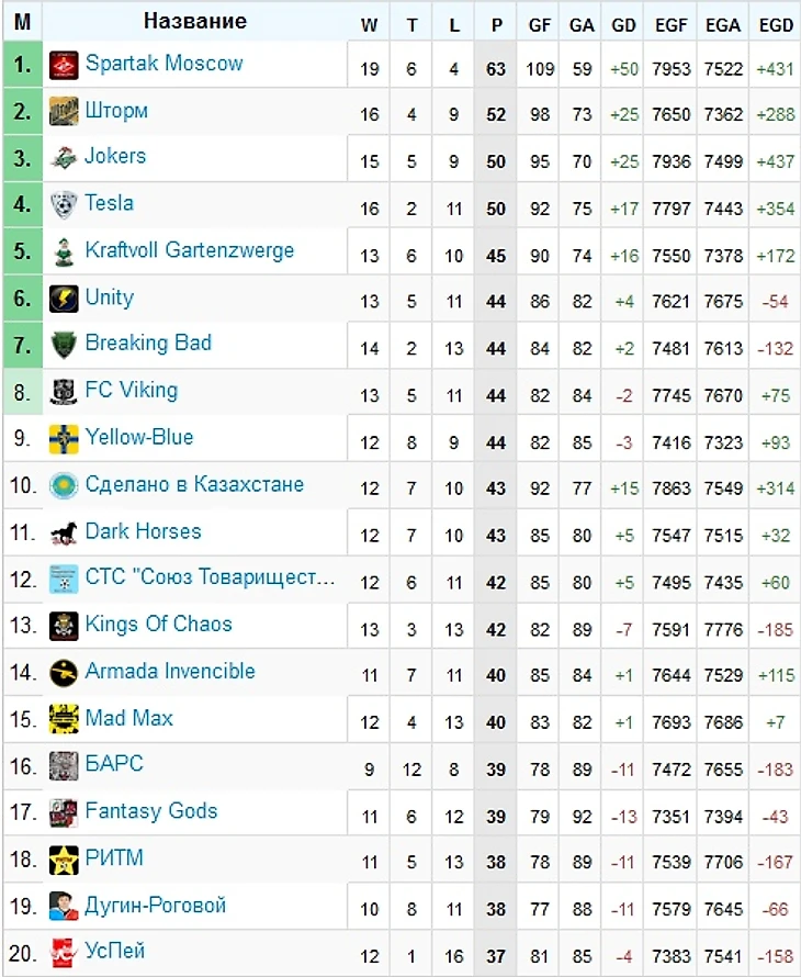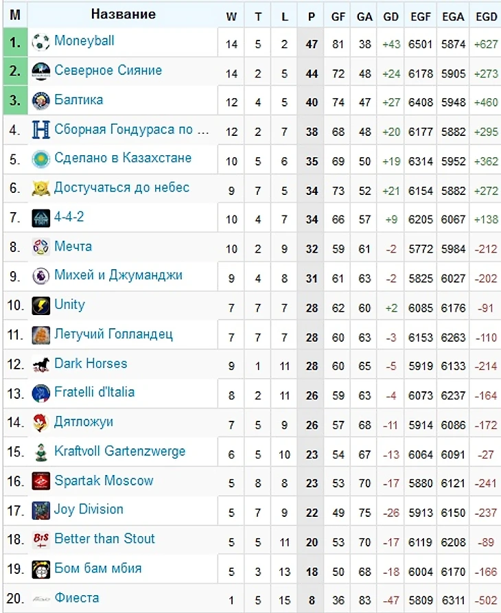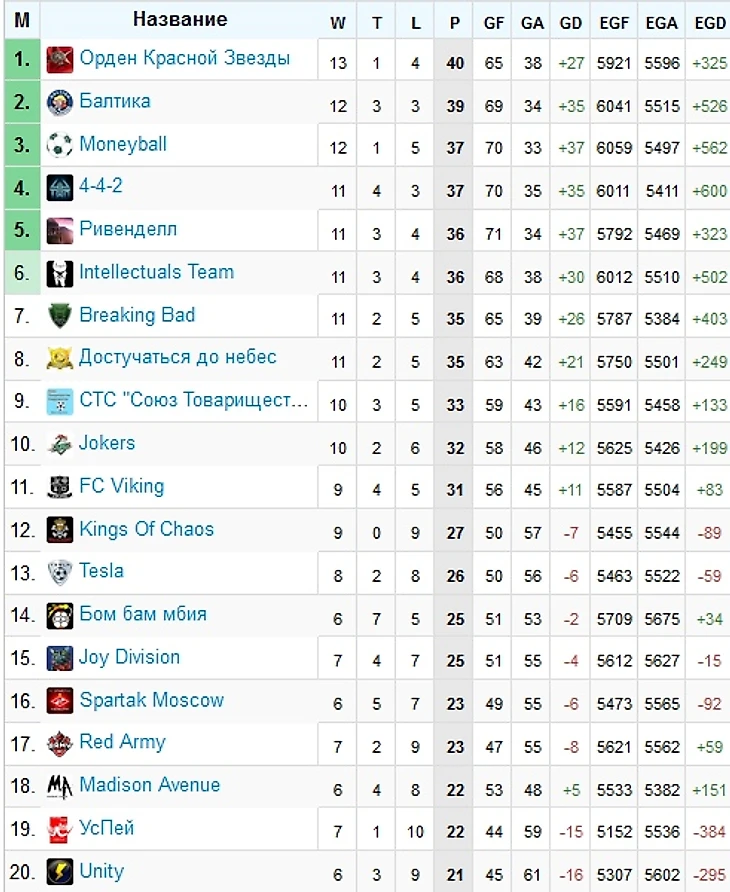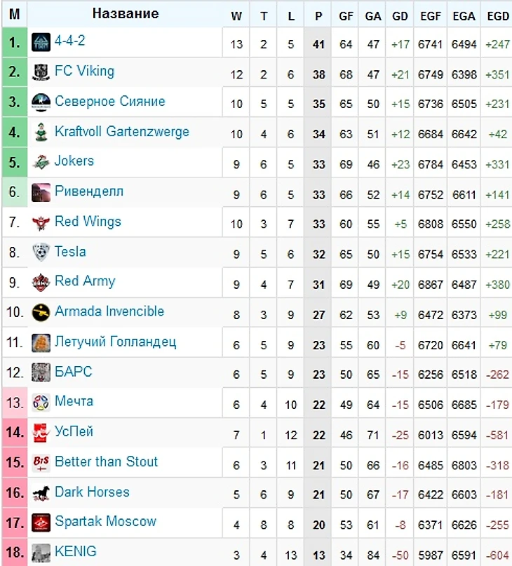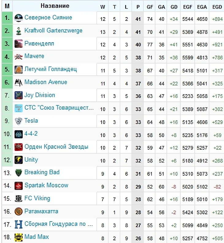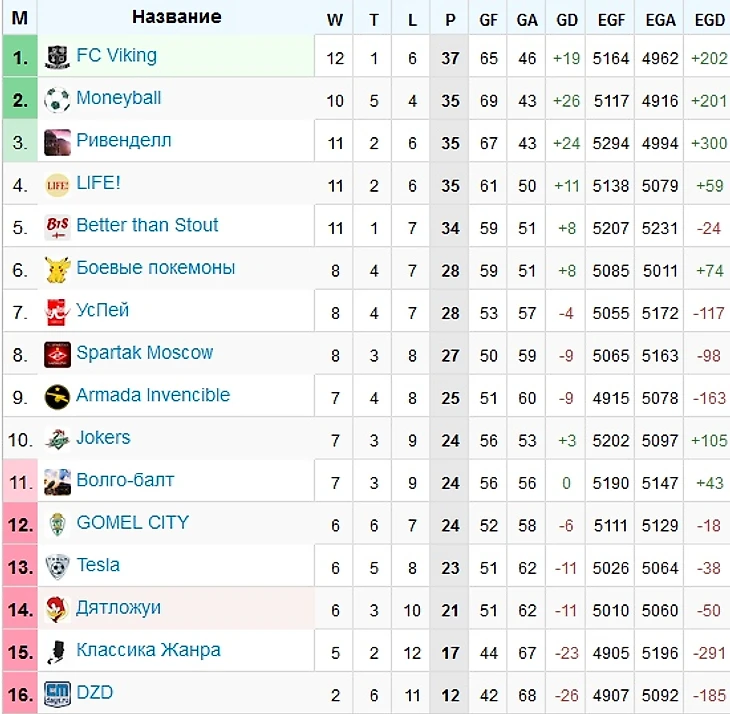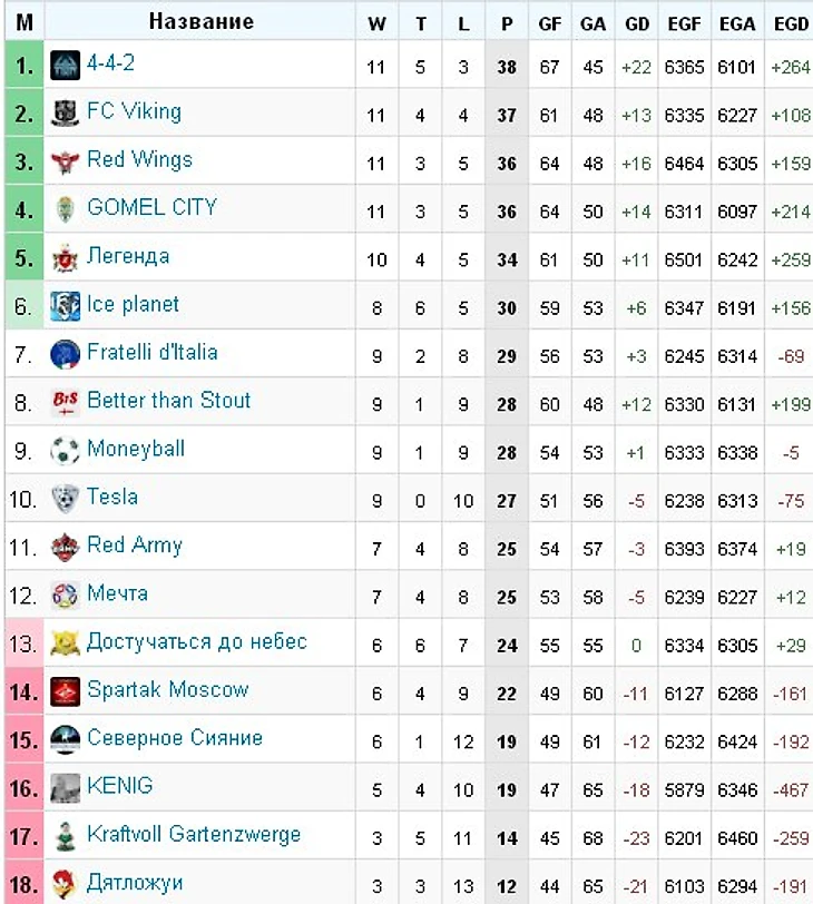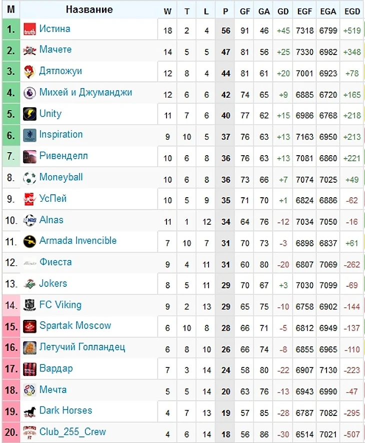 "Истина" абсолютно всем показывает, что находится в этом дивизионе лишь по стечению обстоятельств. Тотальная доминация и унижение соперников позволяют данной команде иметь 20 очков отрыва от 7 стыкового места. Я не собираюсь говорить в осторожных тонах, поэтому поздравляю "Истину" с возвращением в элиту АПЛ. "Мачете" и "Дятложуи" чувствуют себя комфортно, но совсем уж расслабляться не стоит. Примерно до 10 места команды могут претендовать на зеленую зону. Очень удивительно как полутрупный "УсПей" находится так высоко.