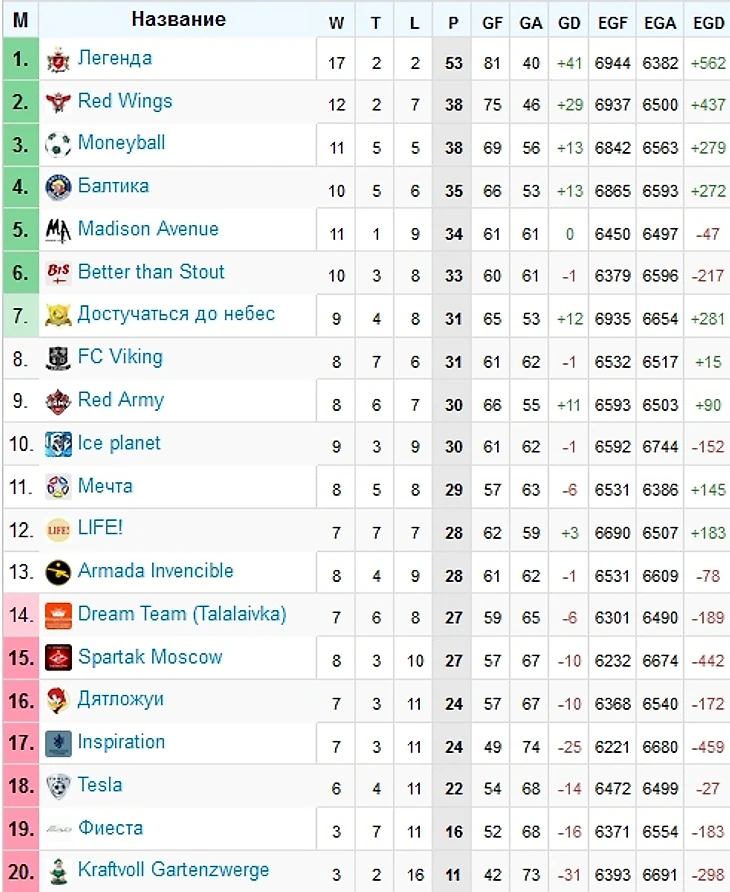 Тут я даже не собираюсь быть осторожным в выражениях. Поздравляю "Легенду" с выходом в Высший Дивизион! Растерять 22 очка просто невозможно, давайте будем реалистами. "Red Wings" и "Moneyball" имеют 7 очков преимущества над командой с 7 места. Что-то мне подсказывает, что они не должны упустить путевки в вышку. Одно скажу точно, в стыки попадать опасно. Там плавают грозные акулы с хорошими ФО. Дальше идет плавающая зона, где можно бороться как за повышение, так и за выживание, в зависимости от результатов. Мое мнение, что "Балтика" должна пойти на повышение. Возможно "Ice planet" скакнет в зеленую зону, правда в стыках им будет тяжело.