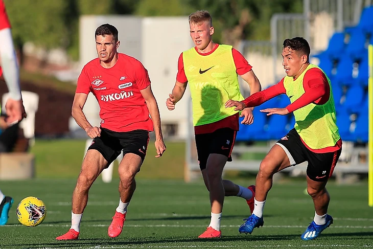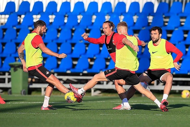 Сегодня красно-белые провели одну тренировку на сборе в Катаре. После разминки игроки поделились на две группы и отрабатывали взаимодействия на ограниченном участке поля.