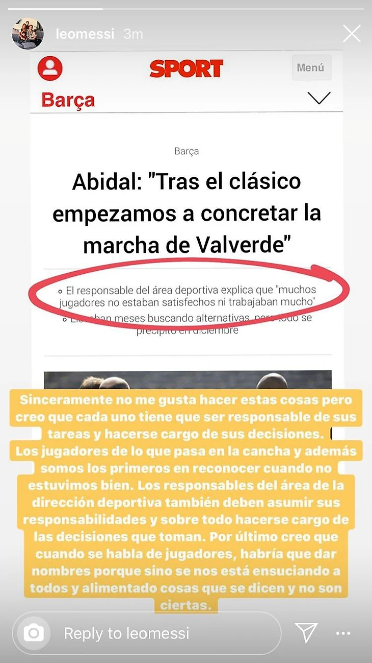 На интервью спортивного директора отреагировал капитан «Барсы»: Лео опубликовал в сторис скрин из статьи Diario Sport и обвел красным тизер: «Спортивный руководитель клуба объясняет, что «многие игроки не были довольны или работали не так много».
