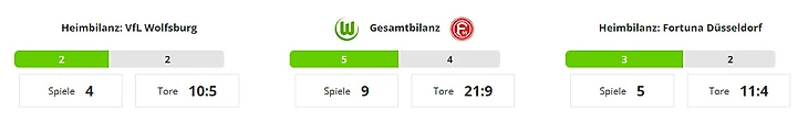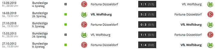 В девяти последних матчах против «Фортуны» «волки» ни разу не проиграли (в первой и второй Бундеслиге). Они победили пять раз и сыграли вничью четыре, каждый раз забивая как минимум один мяч.