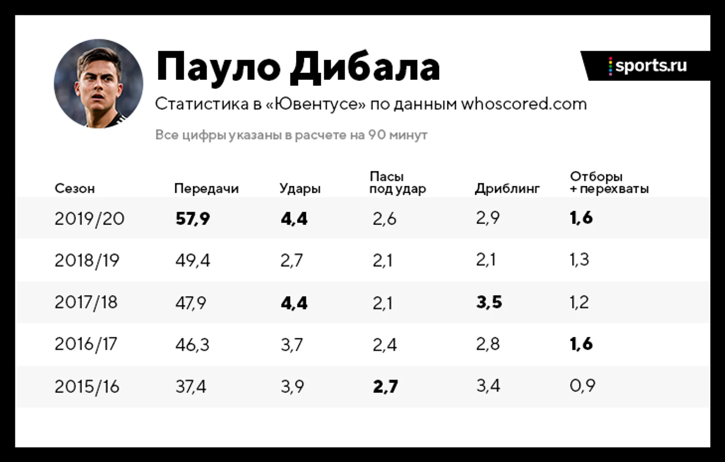 В этом сезоне он не подвел ни разу. Он лучший в клубе по пасам под удар, дриблингу, второй из атакующих – по отработке в защите. Дибала делает результативное действие каждые 76 минут (11+11) – на полтайма чаще Роналду и намного больше всех остальных. В 12 играх его голы и ассисты приносили очки. Пауло изменил исход почти половины матчей, в которых играл.