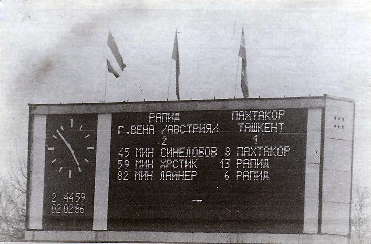 «Пахтакор» (Ташкент) - «Рапид» (Вена) - 1:2 (1:0). 2 февраля 1986 года. Ташкент. Центральный стадион «Пахтакор». 0 градусов. 25 000 зрителей. Судьи: ?