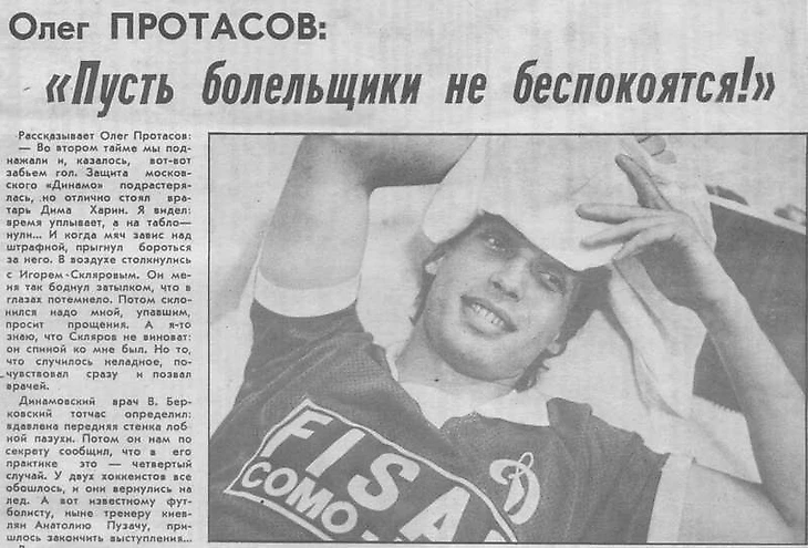 Олимпийский чемпион Сеула-1988 Игорь Скляров, конечно же, не желал травмировать «серебряного» призера Евро-1988 Олега Протасова. Все произошло в пылу борьбы. А дальше, можно сказать: «Хорошо то, что хорошо заканчивается». Это хорошо, что голкипер московского «Динамо» Дмитрий Харин сразу же после падения Протасова начал активно сигнализировать судье, чтобы тот срочно остановил матч, а так же жестикулировать в сторону скамейки запасных, чтобы быстро бежали на помощь к пострадавшему. Это хорошо, что дежурный врач нейрохирургической клиники слушал прямой репортаж матча по радиостанции «Промінь» (украинский аналог «Маяка», только более качественный и интересный), и сразу же приготовился к приему важного клиента. Быстрота и слаженность действий врачей «скорой помощи» (скорость доставки) и больницы (моментальный рентген плюс точный диагноз) обеспечили Олегу быстрое лечение. Хорошо, что травма оказалась не такой опасной, как сие представлялось на первый взгляд, ведь у Протасова «от природы большая лобная пазуха, что и предотвратило худшие последствия», как сказал второй дежурный врач Иван Петрович Проценко.