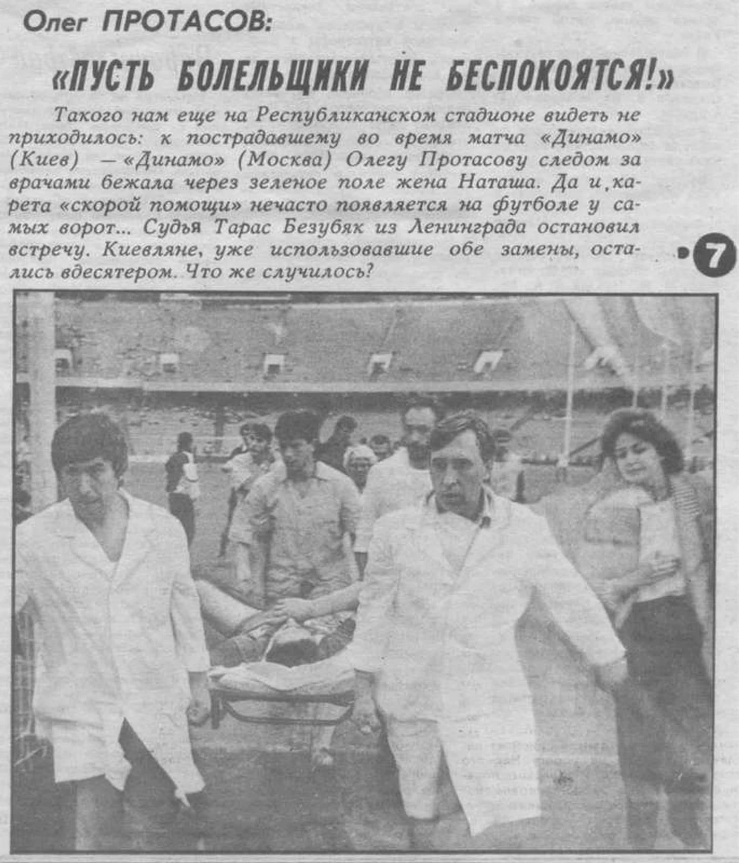 Кстати, вместе с врачами на поле выбежала и жена Олега Протасова, дочь известного в Украине тренера Евгения Лемешко (до 1988 года тренировавшего харьковский «Металлист») – Наташа. На втором фото крайняя справа вроде бы похожа. И пока Наталия Евгеньевна, немного успокоившись после того, как Протасов пришел в себя и почувствовал легче, побежала домой по адресу Киев, улица Полины Осипенко, чтобы по телефону успокоить маму Олега и собрать ему кое-какие вещи, к самому футболисту в палату №4 нагрянули журналисты: