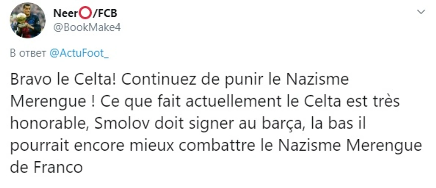 «Браво, «Сельта»! Продолжайте наказывать фанатов-нацистов! Смолова нужно подписать в «Барсу», чтобы там он мог даже лучше бороться с нацизмом фанатов Франко».