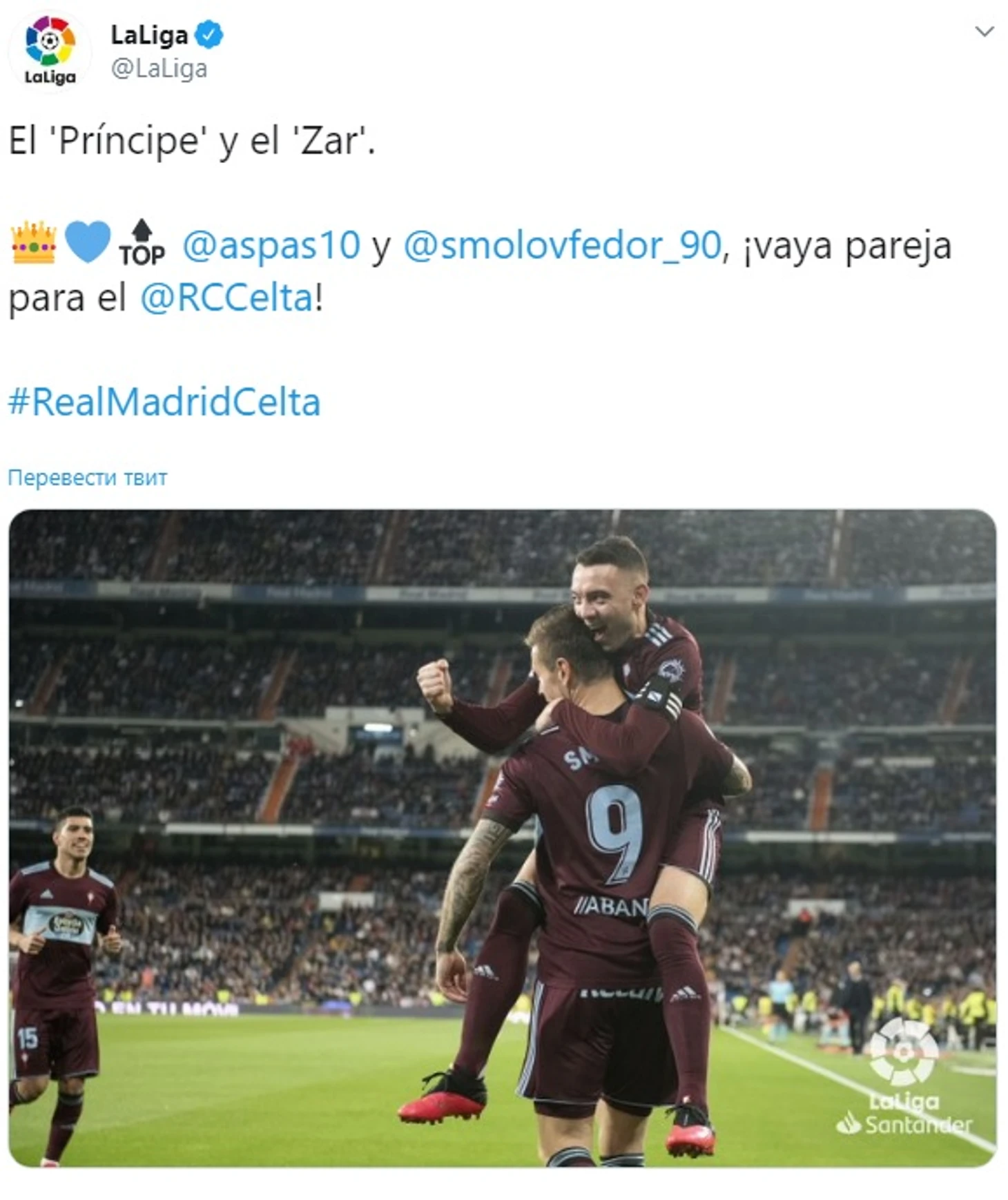 Ла Лига запостила фото Аспаса и Смолова со скромной подписью: «Принц» и «Царь». Понятно, кто есть кто: Федора с первого дня в «Сельте» сравнивают с Александром Мостовым.