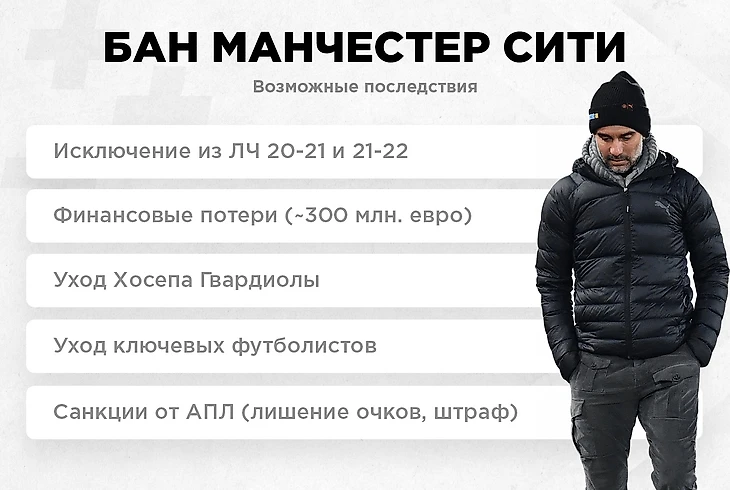 Кроме того, это будет серьезный удар по клубу с финансовой точки зрения. Помимо штрафа в размере 30 млн. евро, они будут без доходов от Лиги чемпионов в течение двух сезонов. Конечно, заработок зависит от многих факторов, в том числе и от степени продвижения по турниру, но в прошлом сезоне "Манчестер Сити" получил 93 млн. евро, а с учетом возросших призовых, потери за два года легко перешагнут за отметку 200 млн. евро. Прибавьте к этому проблемы со спонсорскими соглашениями, некоторые из которых предусматривают автоматические урезания в случае, если вы не участвуете в Лиге чемпионов, и сумма потерь увеличится еще на 100 млн. евро.