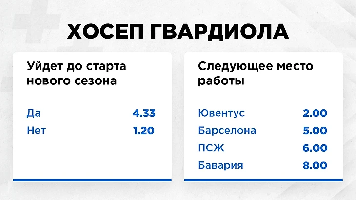 Не остались в стороне от происходящего и букмекерские конторы. Прямо сейчас они считают, что Гвардиола будет стоять у руля "Манчестер Сити" в первый игровой день нового сезона АПЛ. Согласны? Тогда для вас приготовлен коэффициент 1.20 — согласитесь, слишком самоуверенно. Обратная ситуация может значительно обогатить кошельки беттеров, ведь на уход Пепа до старта следующего сезона дают коэффициент 4.33.