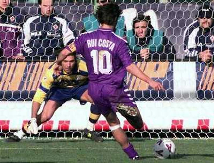 Руй Кошта забивает пенальти Джанлуиджи Буффону. Доставалось в те годы и другим вратарям лиги от «фиалок» и лично от флорентийского маэстро, Мануэль забил более 40 голов.