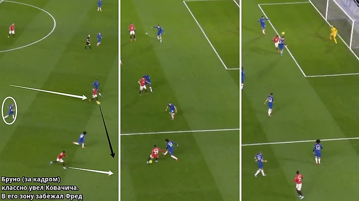 Вертикаль на левом фланге Шоу – Фред/Матич – Бруно – Марсиаль/Джеймс брала количеством и скоростью розыгрышей из-за большей пассивности Мейсона в обороне по сравнению с Канте, в то время как правый фланг был отдан на откуп Уан-Биссаки, с чем он отлично справился: