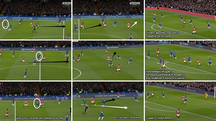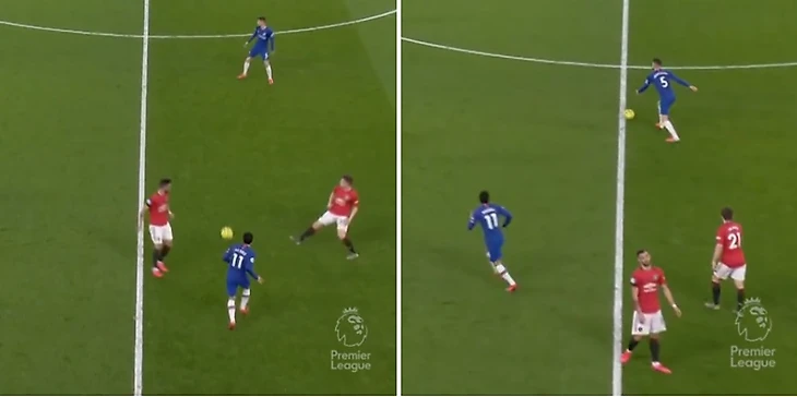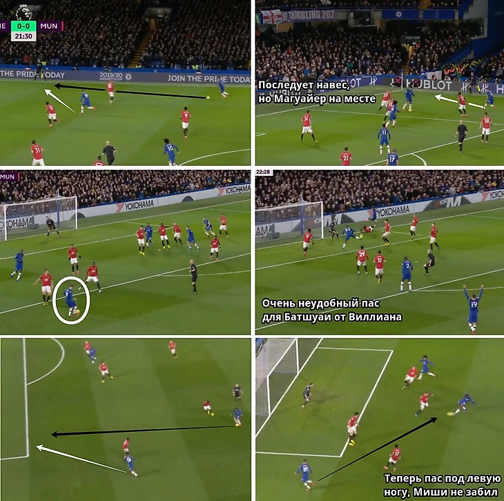 С начала второго тайма Виллиан начал активнее смещаться в центральную ось подальше от опеки Люка Шоу, при этом не забывая помогать на фланге Риису Джеймсу и Маунту.