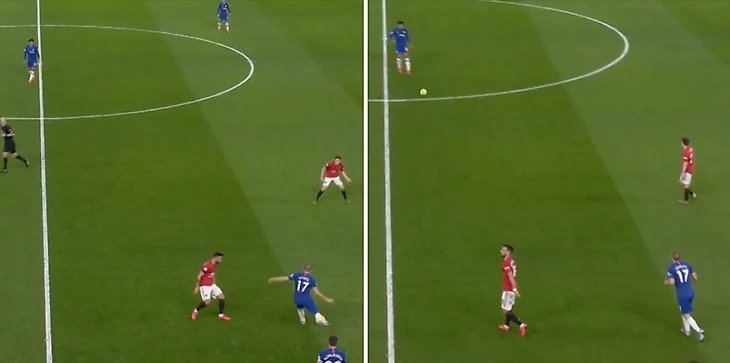 Тяжело сказать, кто именно в этих моментах играл неправильно, либо Марсиаль должен был опускаться ниже, либо Бруно не следовало так активно бежать за оппонентом и не отрезать тем самым Джеймса от прессинга, в любом случае, это дело сыгранности.