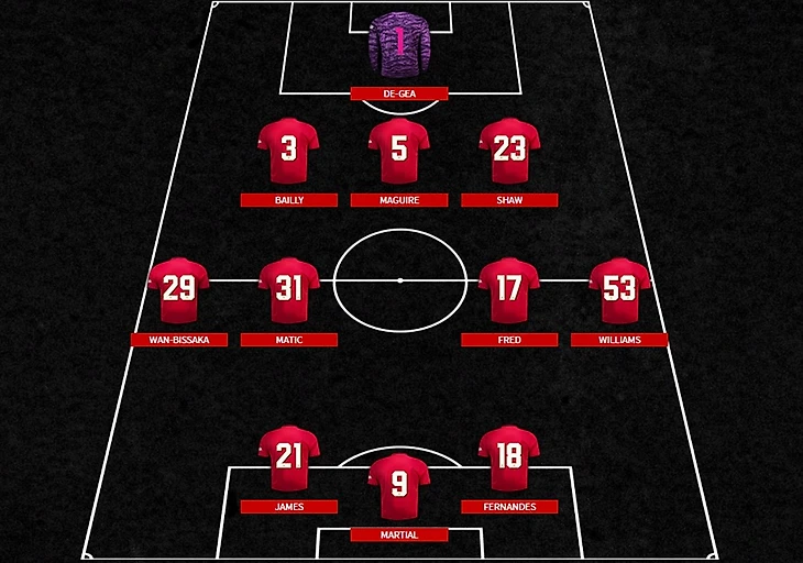 Однако, не изобретая колесо, тренерский штаб Манчестер Юнайтед выбрал Антони Марсиаля в качестве форварда. Оставалось решить, кто же будет третьим игроком нападения Джеймс/Мата/Перейра/Гринвуд. В старте вышел Дэн «Флэш» Джеймс, всё-таки матч на выезде, а отрабатывать в обороне за Марсиаля кто-то должен.