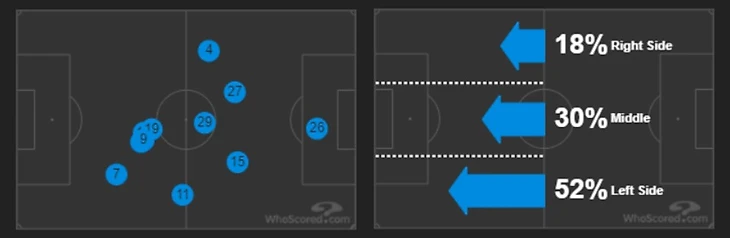 Как всегда, больший крен атаки Манчестер Юнайтед на левый фланг. Здесь широко открывается Джеймс и забегает за спины соперников, сюда смещается Бруно, отсюда же предпочитает начинать движение и Марсиаль. Правый край, как повелось, оставался целиком и полностью Уан-Биссаке, но в помощь ему тренерский штаб отрядил ещё Фреда и Гринвуда.